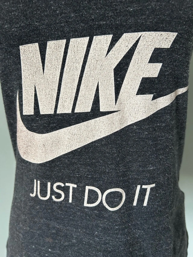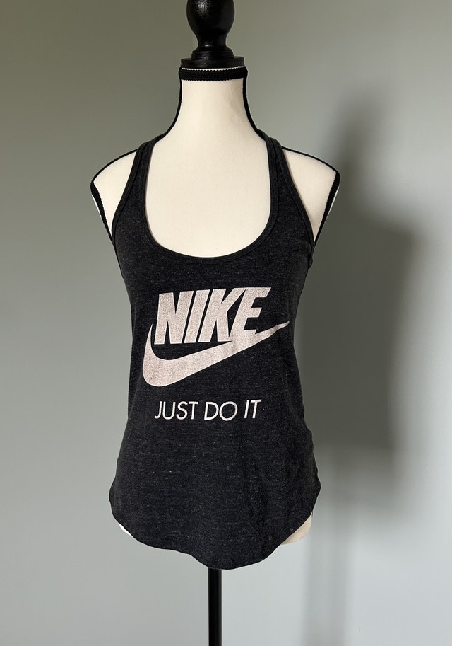 This is a Nike tank top, perfect for workouts or casual wear, featuring the iconic "Just Do It" slogan. This tank has been worn, but is still in good condition.