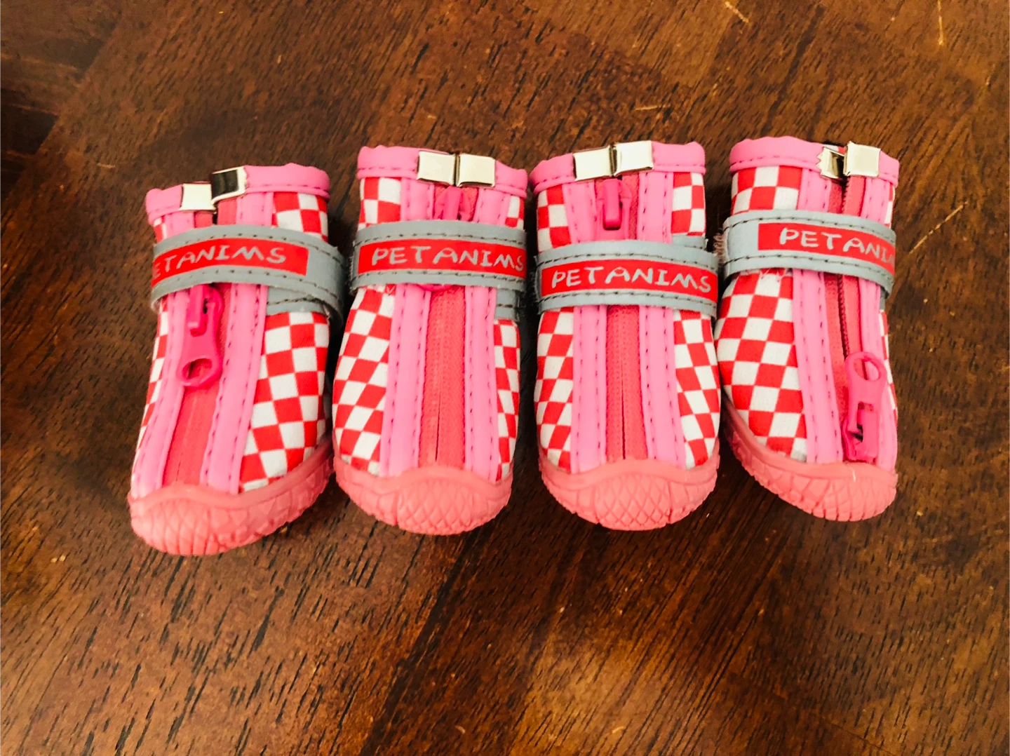 These adorable Petanims dog boots come in a set of four and are perfect for protecting your pup's paws! They feature a cute pink and white checkered pattern with pink accents and a convenient zipper closure. Keep your furry friend stylish and comfortable on all their adventures