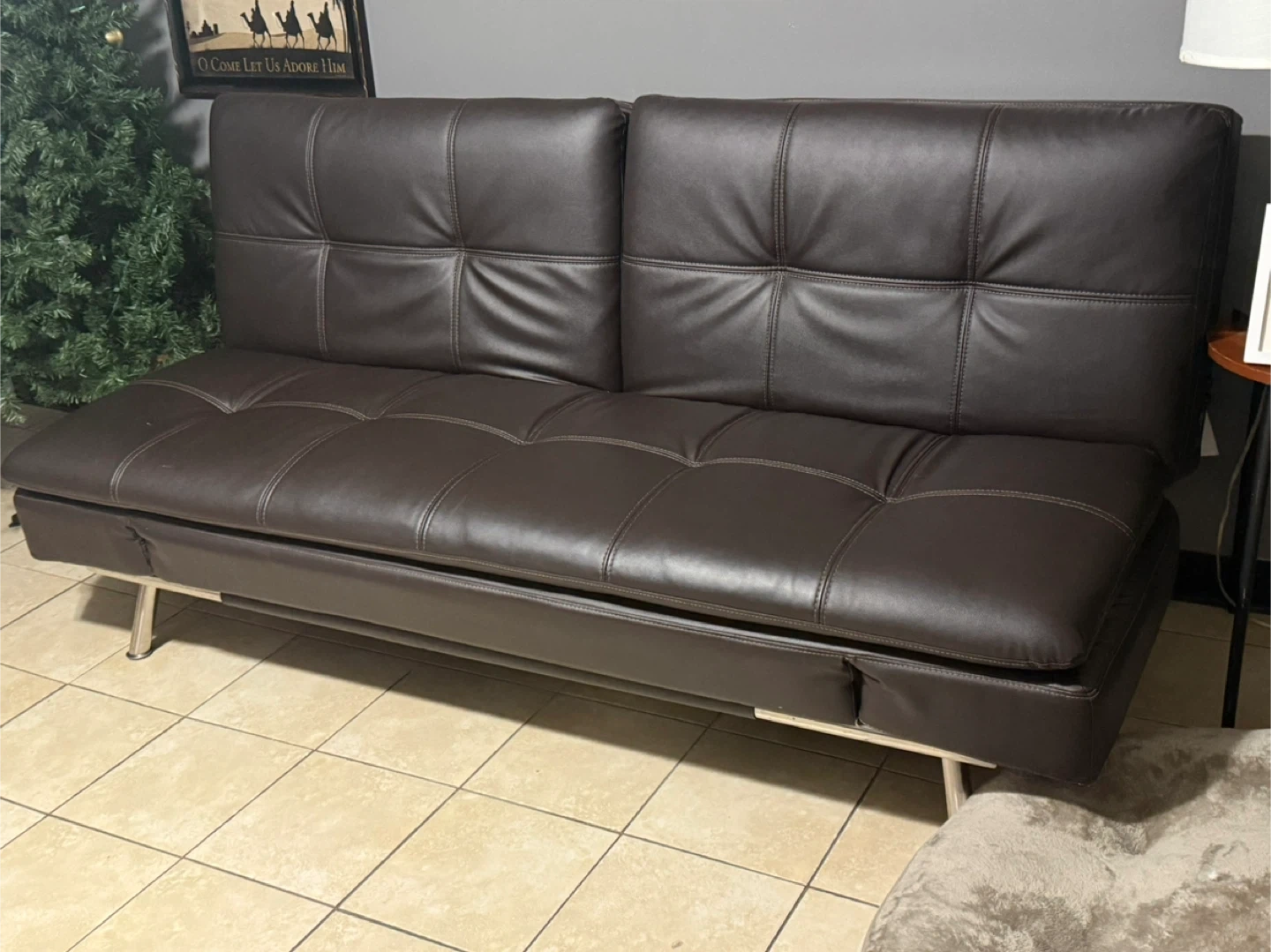 Selling a brown faux leather futon sofa bed. It's in good condition, perfect for a living room or guest room. The futon easily converts into a bed, making it great for accommodating guests. The faux leather material is easy to clean and maintain. It has a modern look with its tufted design and metal legs.
