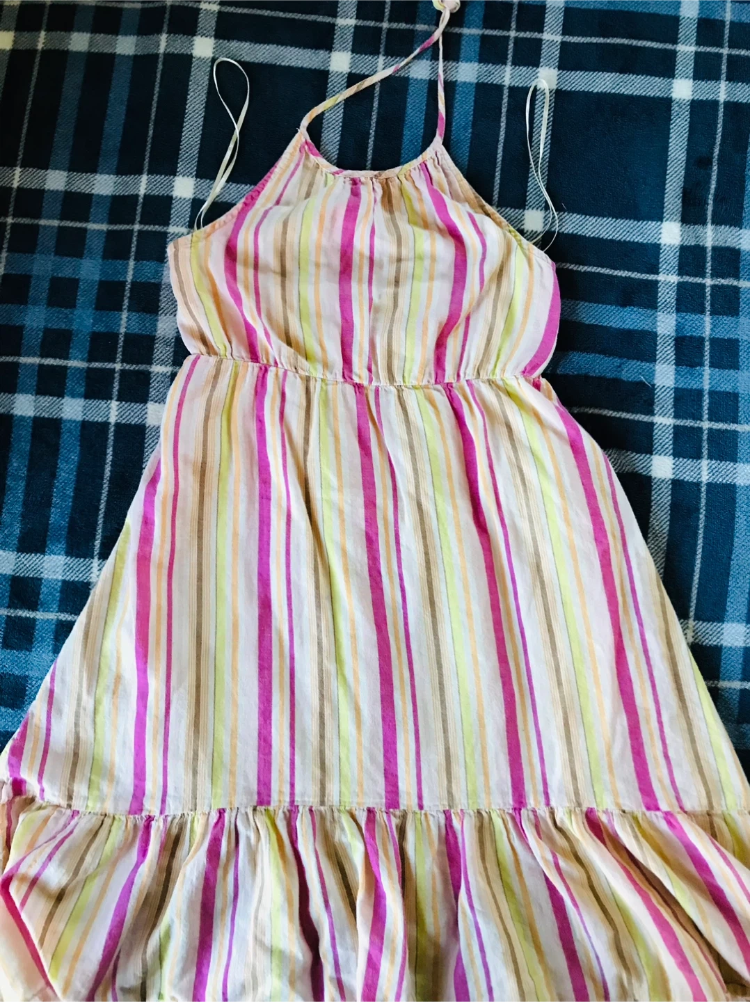 Cute striped sundress in pink, yellow, and brown! It's in great condition and perfect for summer. The dress features thin straps and a ruffled hem. It would be great for a casual day out or a beach vacation