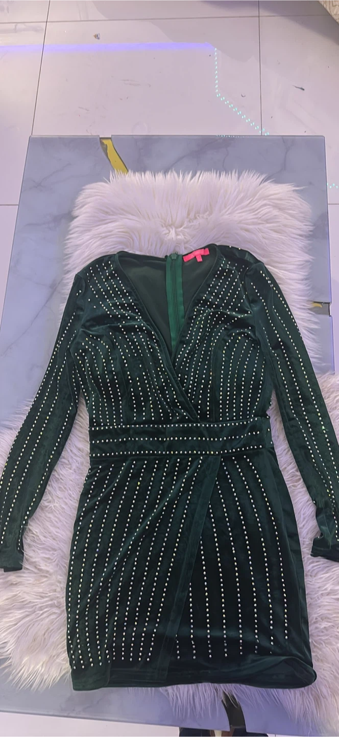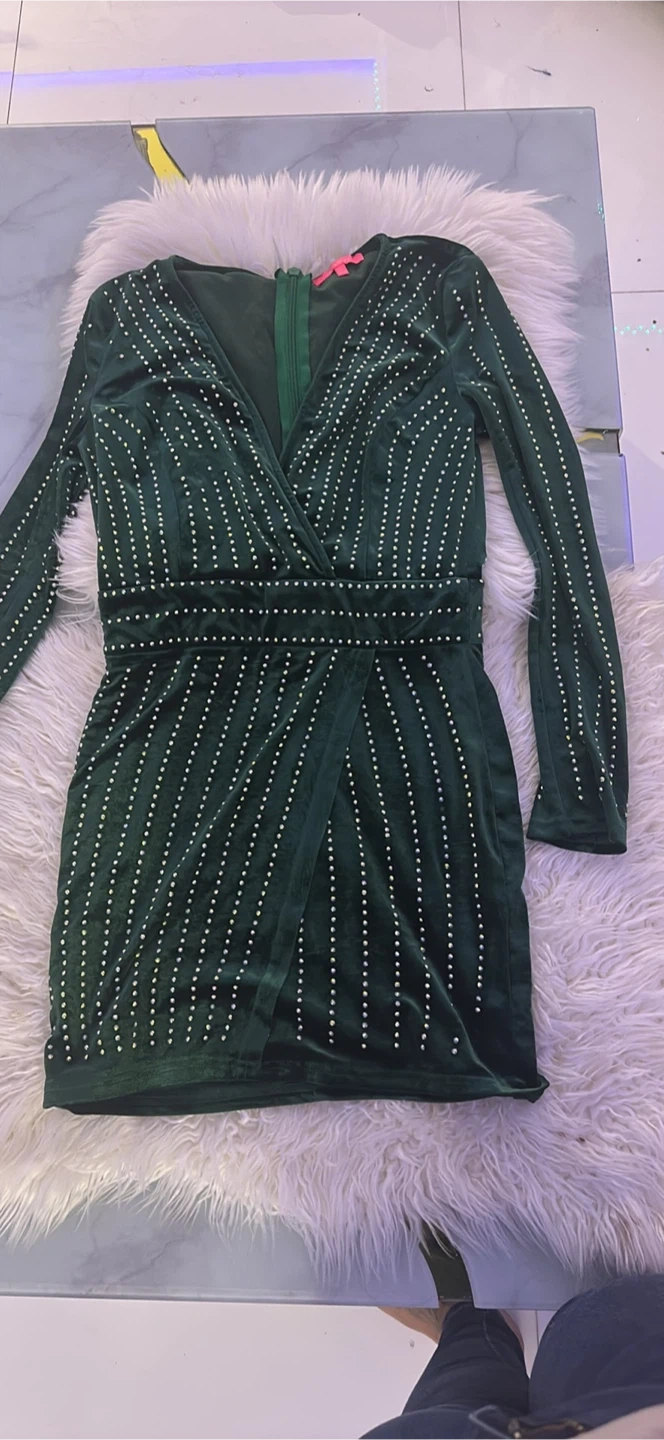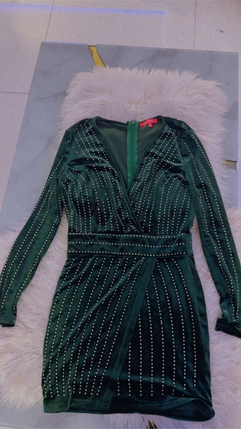 Selling a stylish green velvet mini dress. It features a flattering wrap design and long sleeves, perfect for a night out or special occasion. The dress has a deep V-neck and is adorned with subtle embellishments.