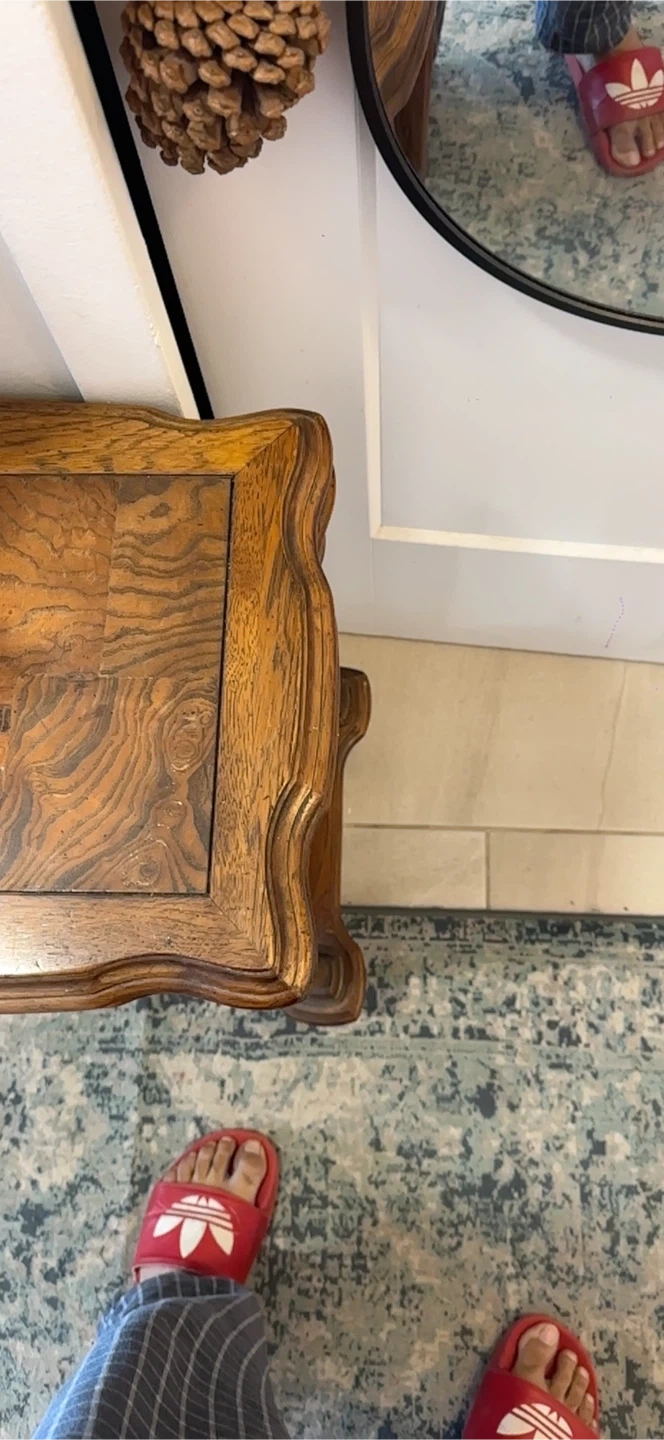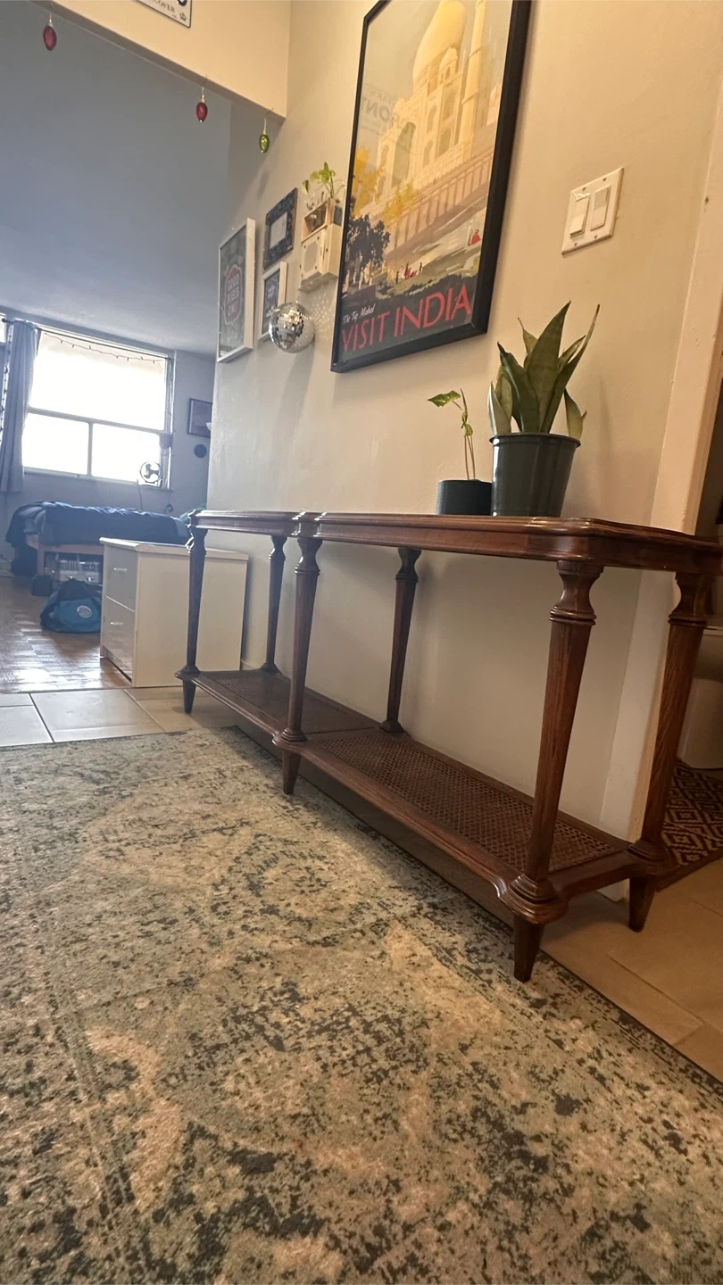 Selling a vintage console table with a beautiful wood grain finish. It features a lower shelf with a woven cane design. There are some signs of wear on the top surface, but it adds to the character of the piece. Perfect for an entryway or living room!