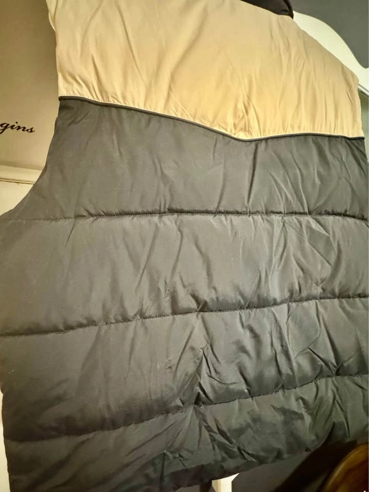 The Levi's Western Puffer Vest. It is a two-tone, colorblocked vest with a black body and a contrasting beige (tan/cream) western-inspired yoke.