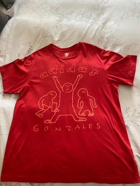 A red Adidas T-shirt with a white "Gonzales' graphic featuring three stick figures on the front. The T-shirt is in excellent condition and has been freshly laundered and pressed. From a pet and smoke free home. Pickup on in the St. Lawrence market area of downtown Toronto. Cash only. Let me know if you're interested!