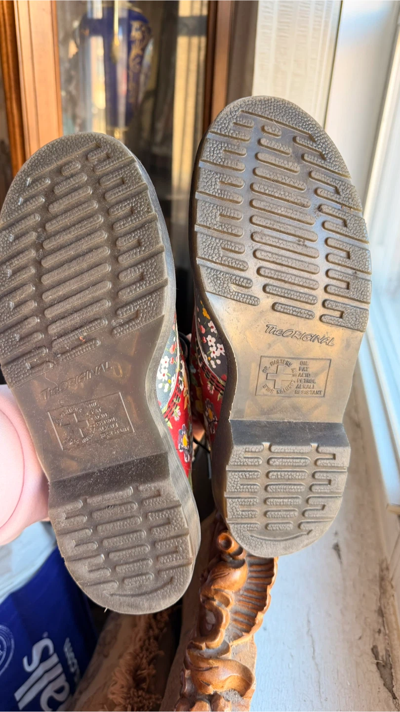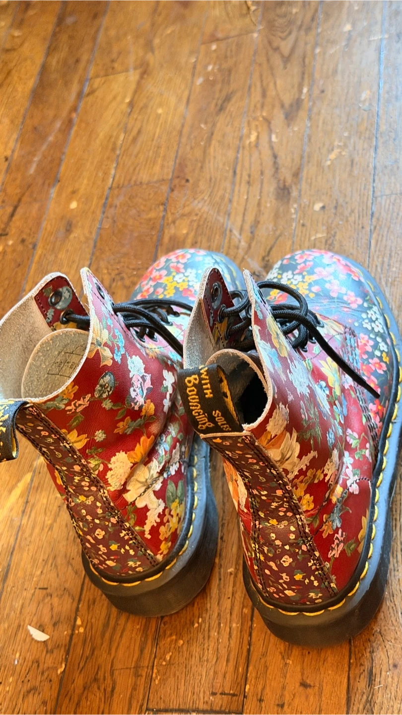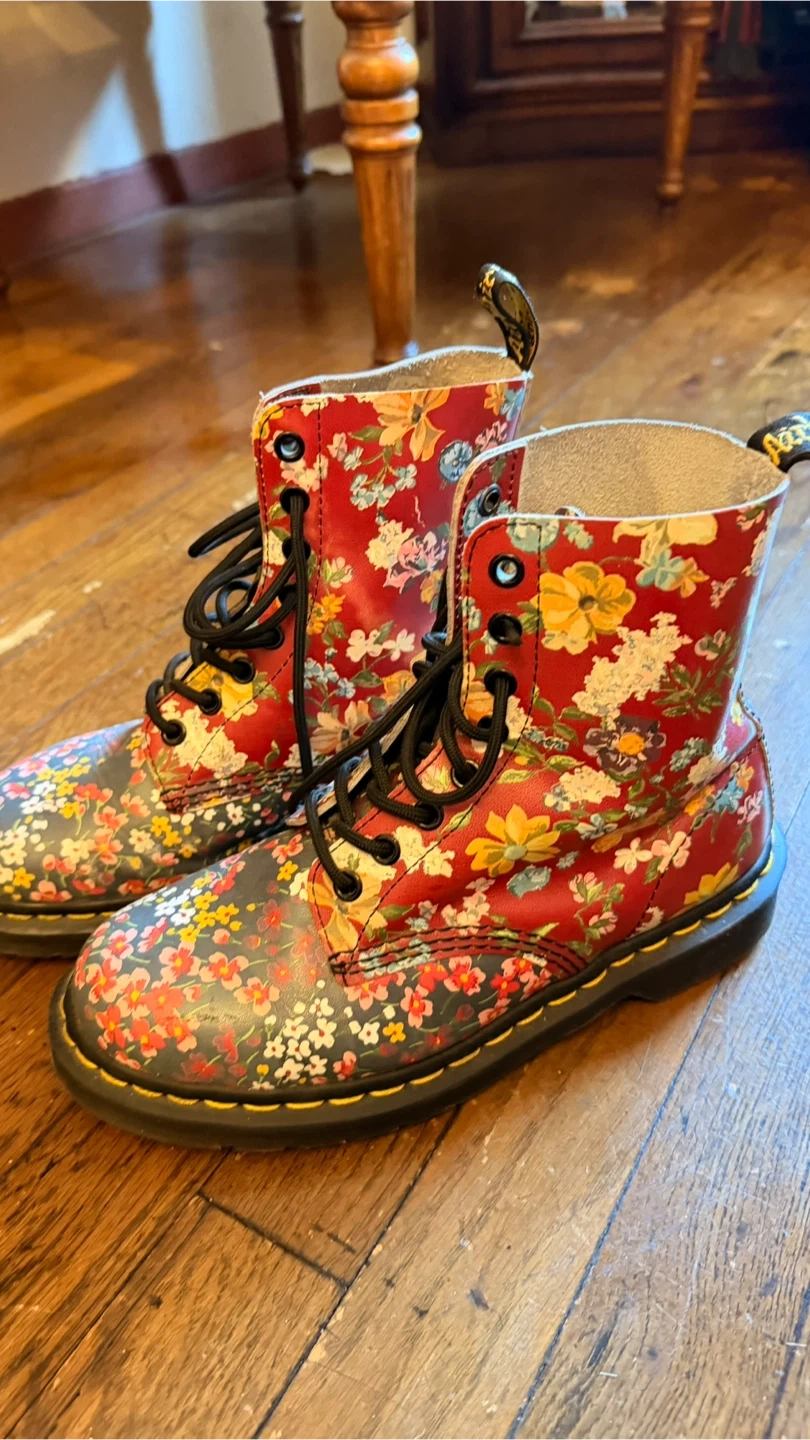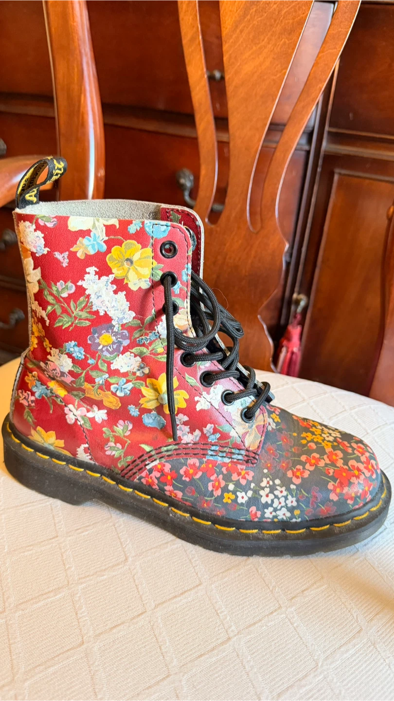 These Dr. Martens boots feature a vibrant floral pattern! They're in good condition and ready for a new adventure. Perfect for adding a pop of color to your outfit