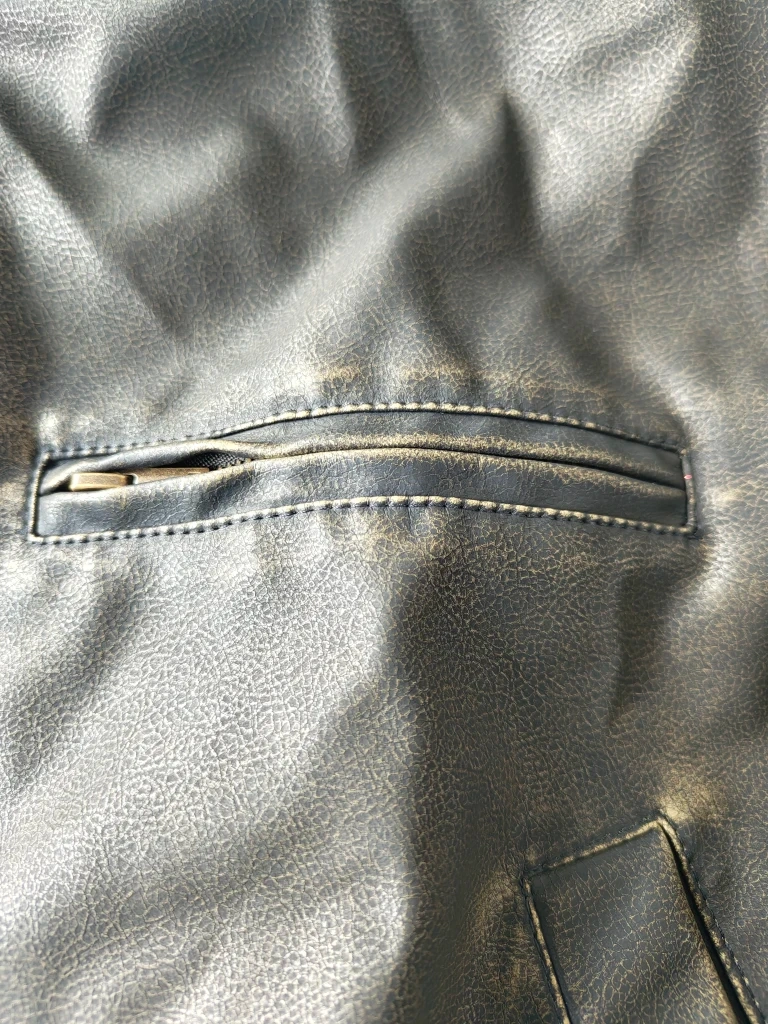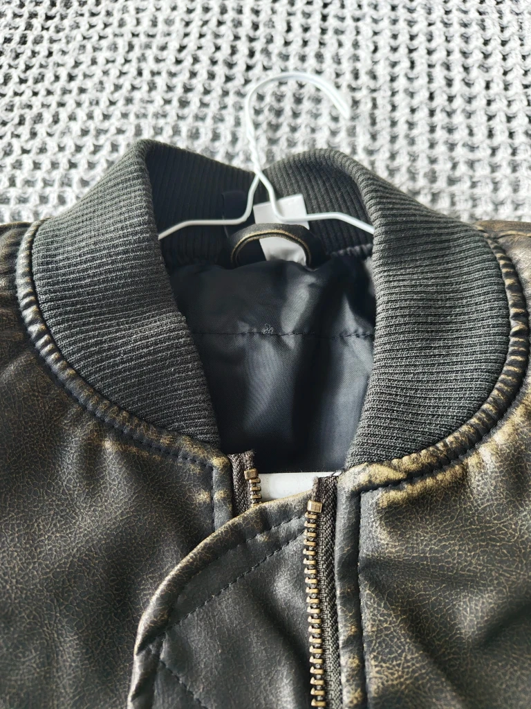 Selling a Divided brand black bomber jacket. It has a zipper closure and pockets. The jacket styling is distressed PU faux leather, and is in great condition.