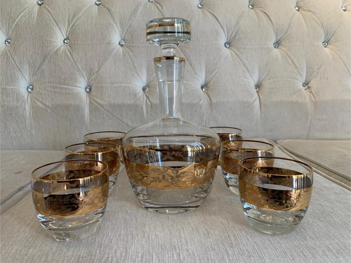Selling a beautiful vintage decanter and glasses set! The set features a clear glass decanter and six matching glasses, all adorned with elegant gold trim and a floral design. Perfect for adding a touch of vintage charm to your home bar or as a special gift!