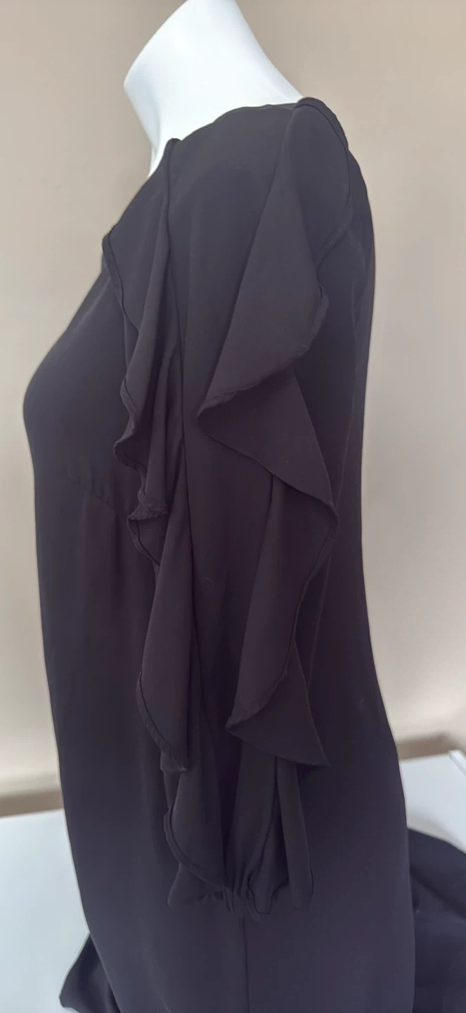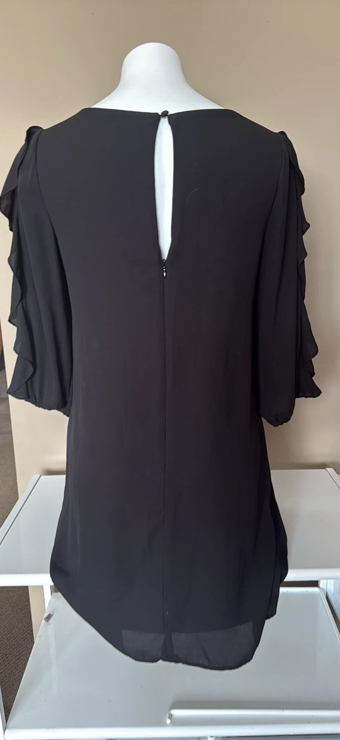 Selling a stylish Vince Camuto black dress in size 6. The dress features beautiful ruffle detailing on the sleeves and a flattering silhouette. It's perfect for any occasion!