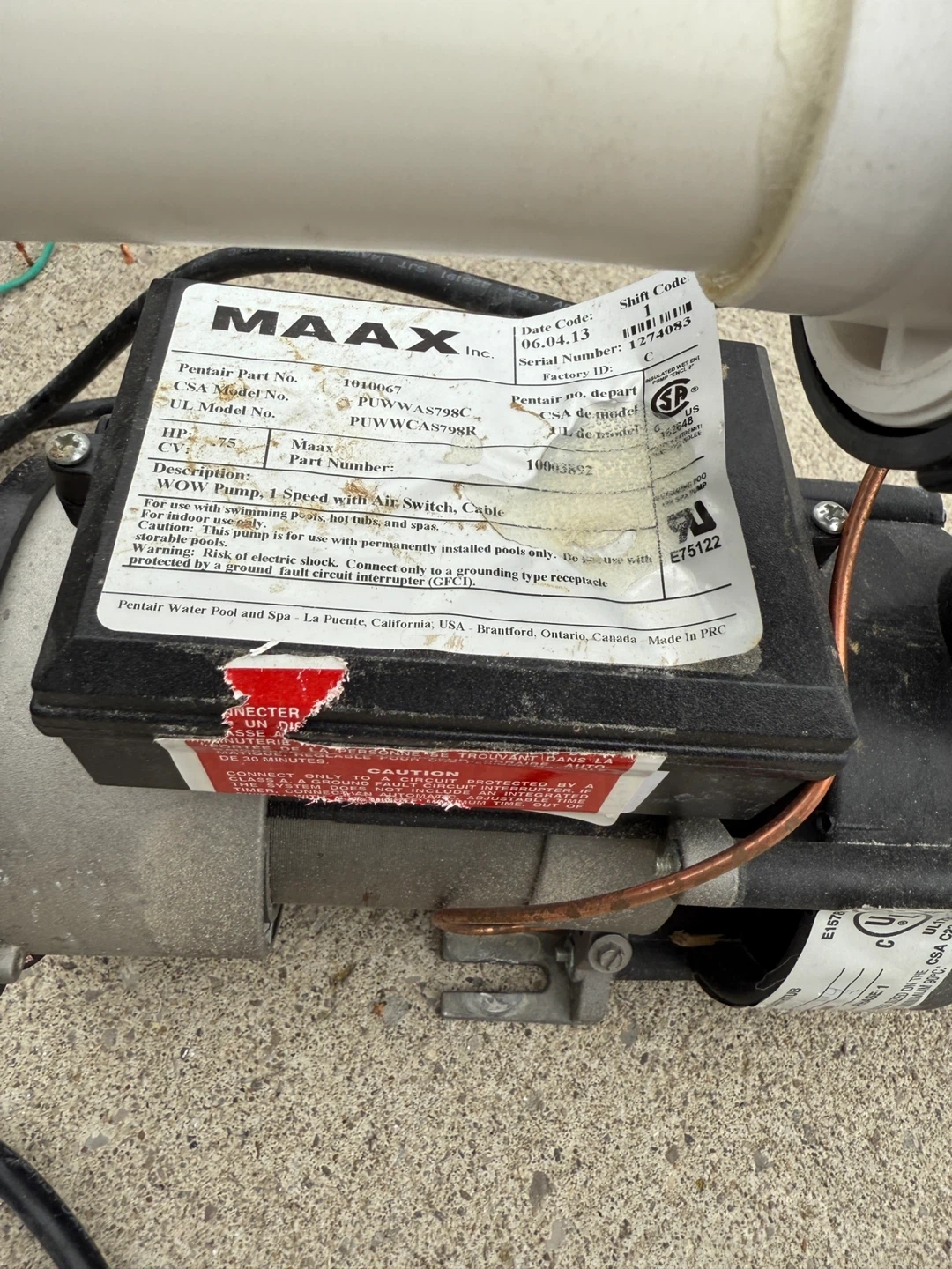 Selling a MAAX Max4 1-Speed pool pump with air switch and cable. It's designed for in-ground pools, hot tubs, and spas. Date Code is 06/04/13.