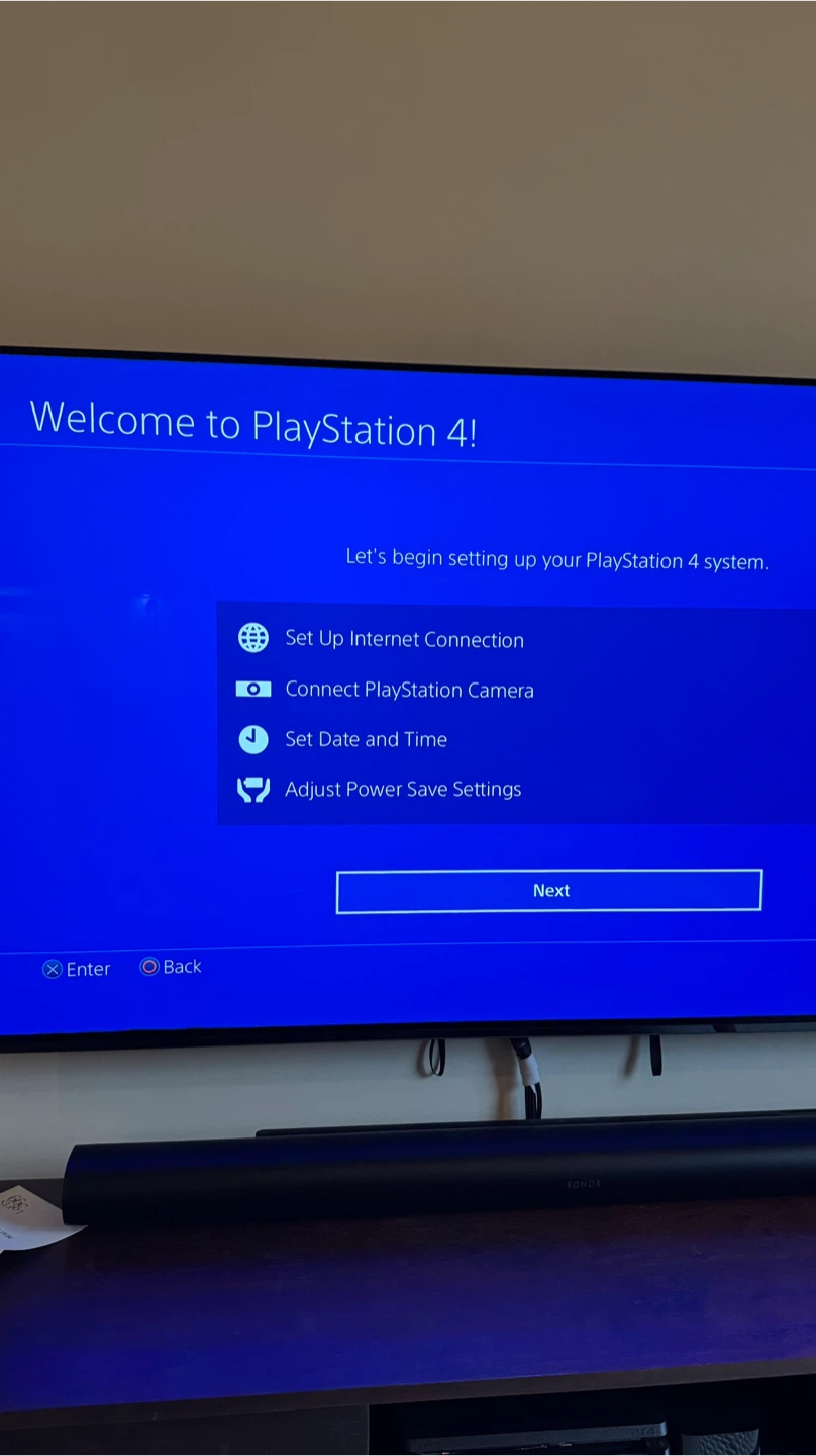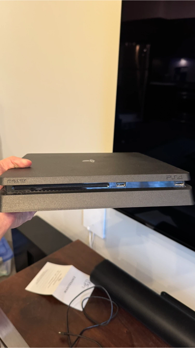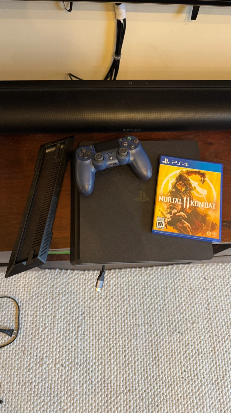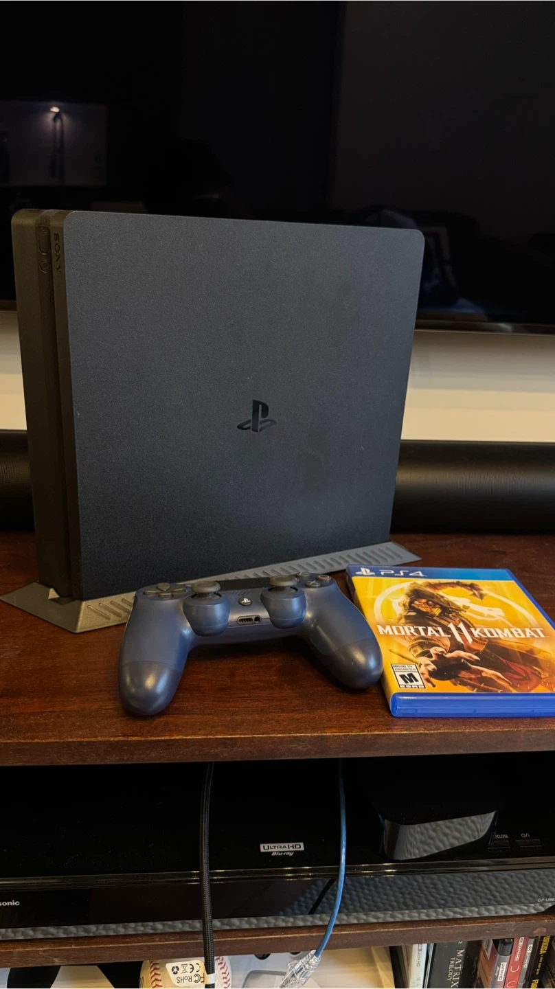 PlayStation 4 slim with controller, stand for the console, and Mortal Kombat 11 included.