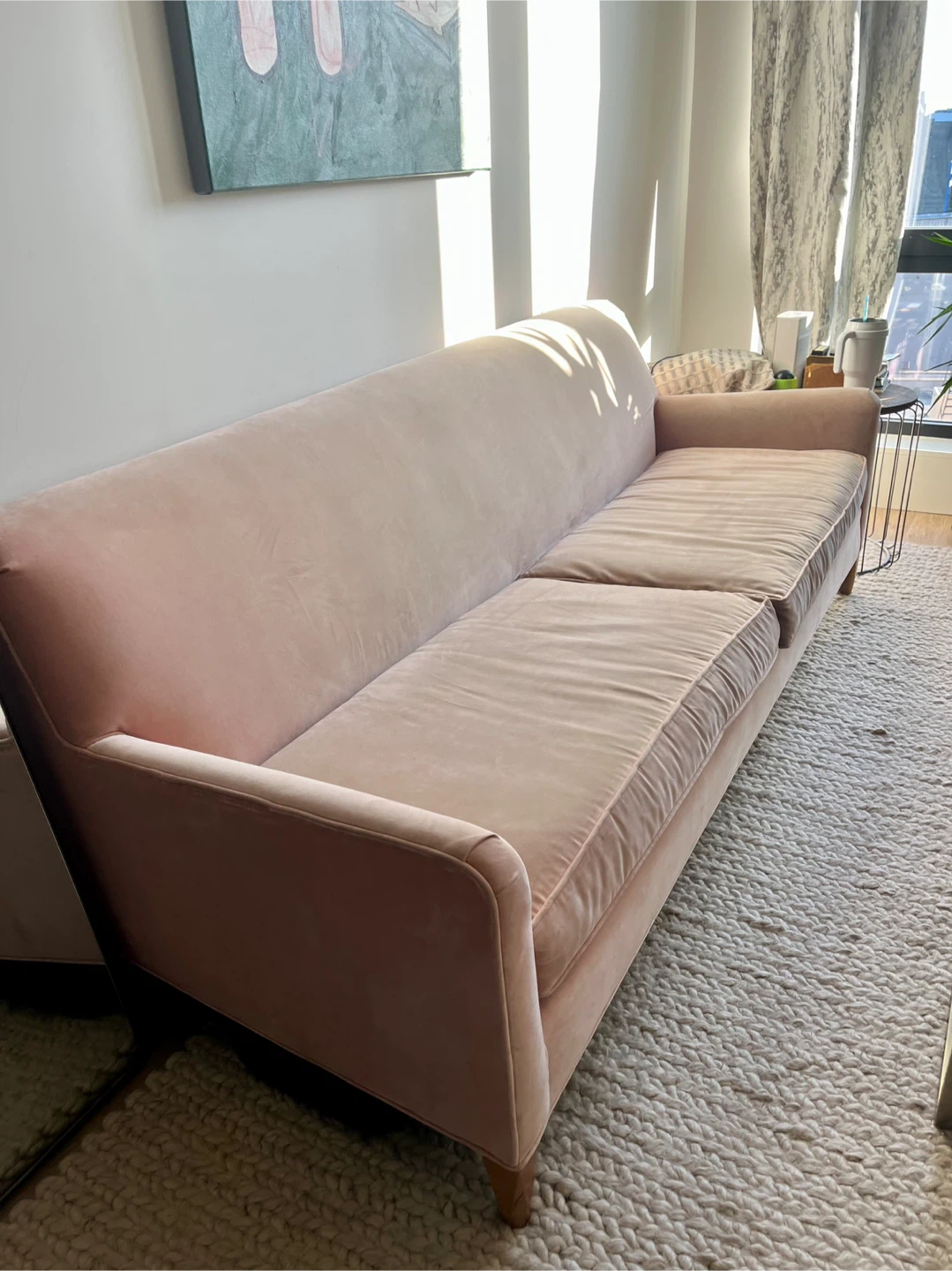 Mitchel Gold + Bob Williams couch for sale. Pink velvet with light wood legs. This was bought new for $3k about five years ago. Still in good shape - no major stains or tears, non-smoking house, no pets. It could probably use a steam clean - we’ve done a professional clean in the past just to remove regular dust/dirt buildup and it was like new. It’s 7ft long x 2ft deep. Must be able to pick this up near the Nostrand A stop in Bed-Stuy.