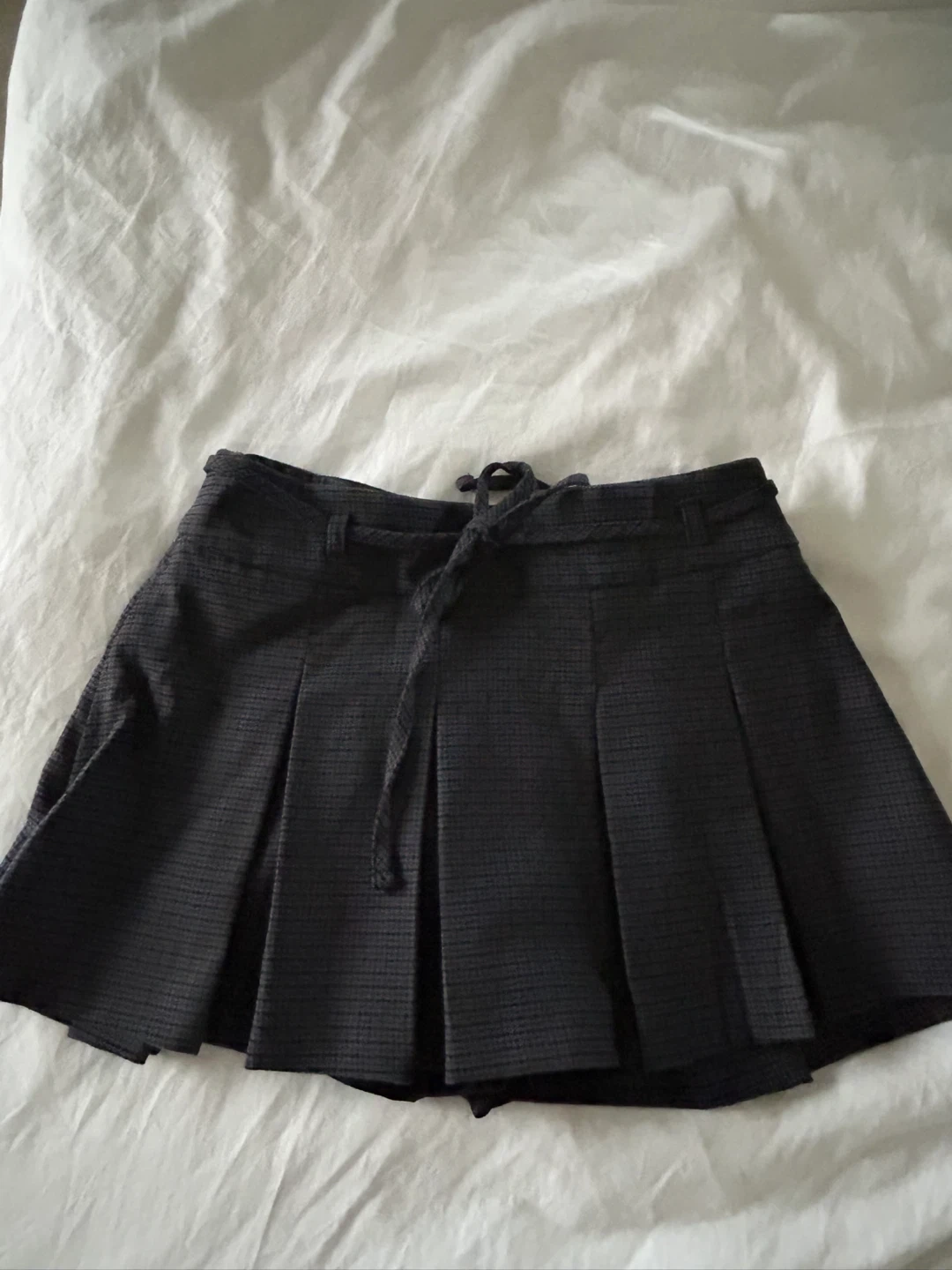 Here's a cute pleated mini skirt! It features a tie at the waist. The color is a dark gray. Never used, It's in great condition!
