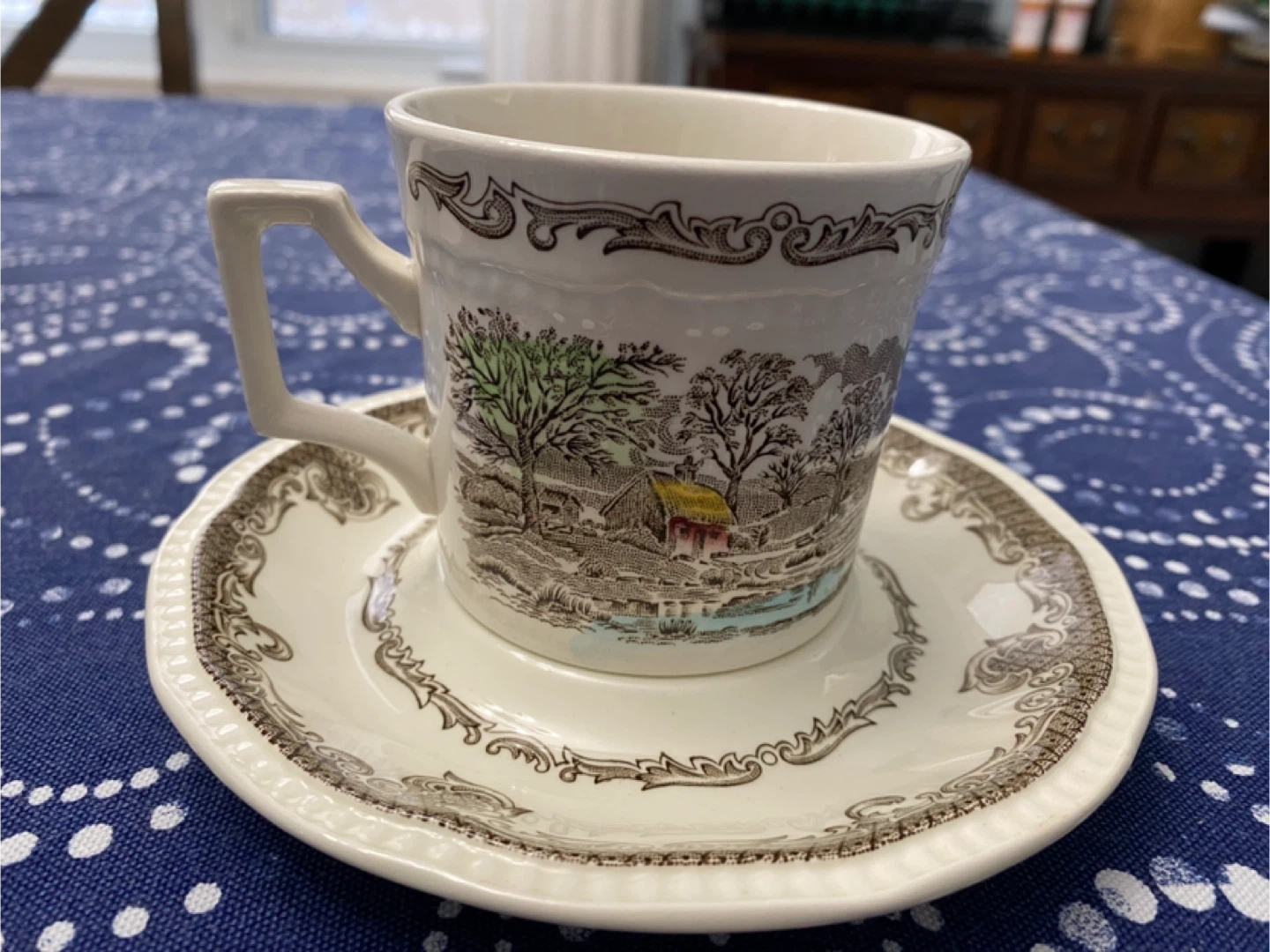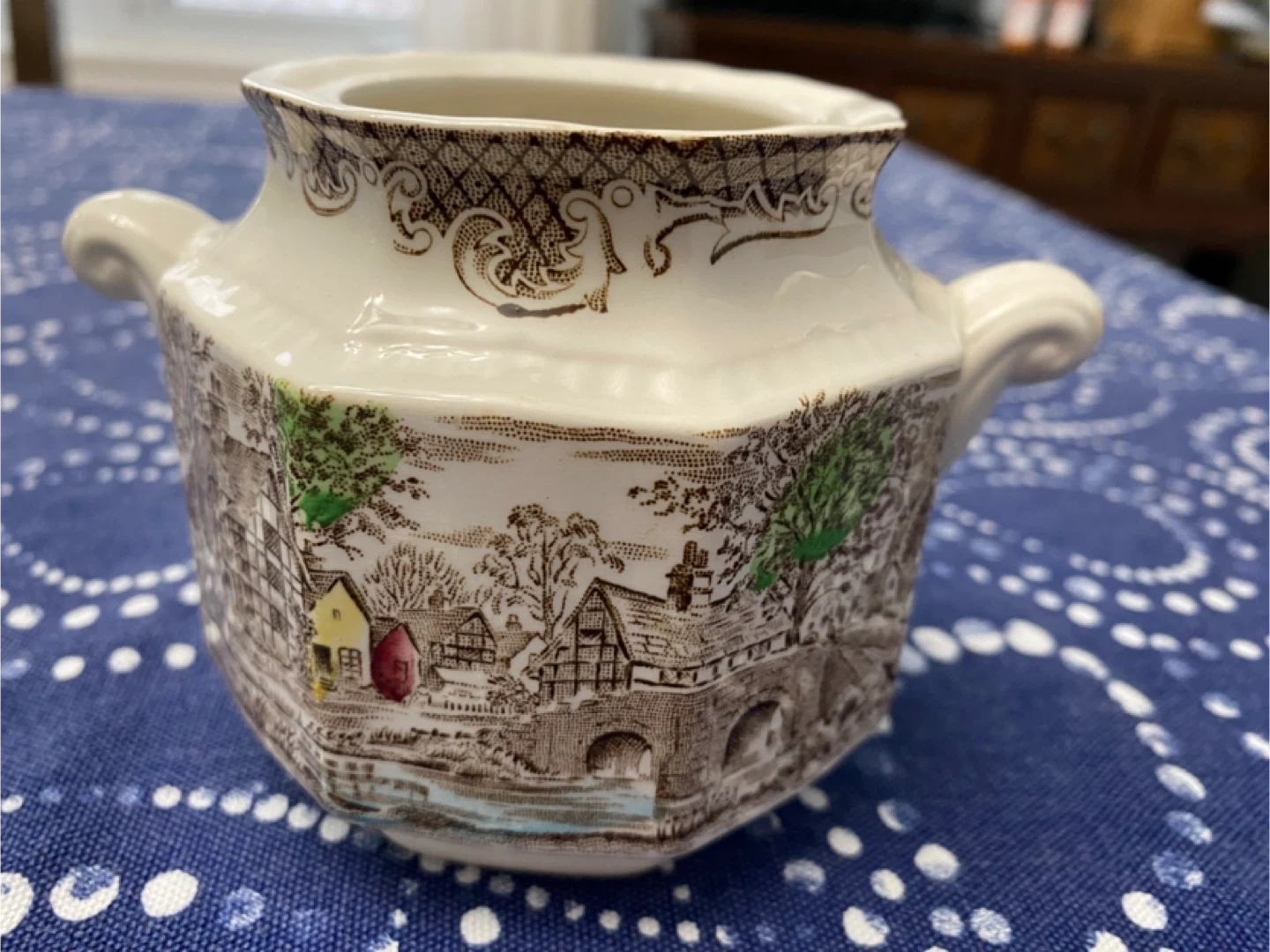 Selling a charming tea set including 6 cups and saucers, a creamer, and a sugar bowl. The set features a lovely pastoral scene in brown and green tones on a cream background, with Shakespeare’s sonnets engraved at the bottom of the saucers and the bowl. Made in England, this set is perfect for adding a touch of vintage elegance to your coffee & tea time. Used but in great condition.