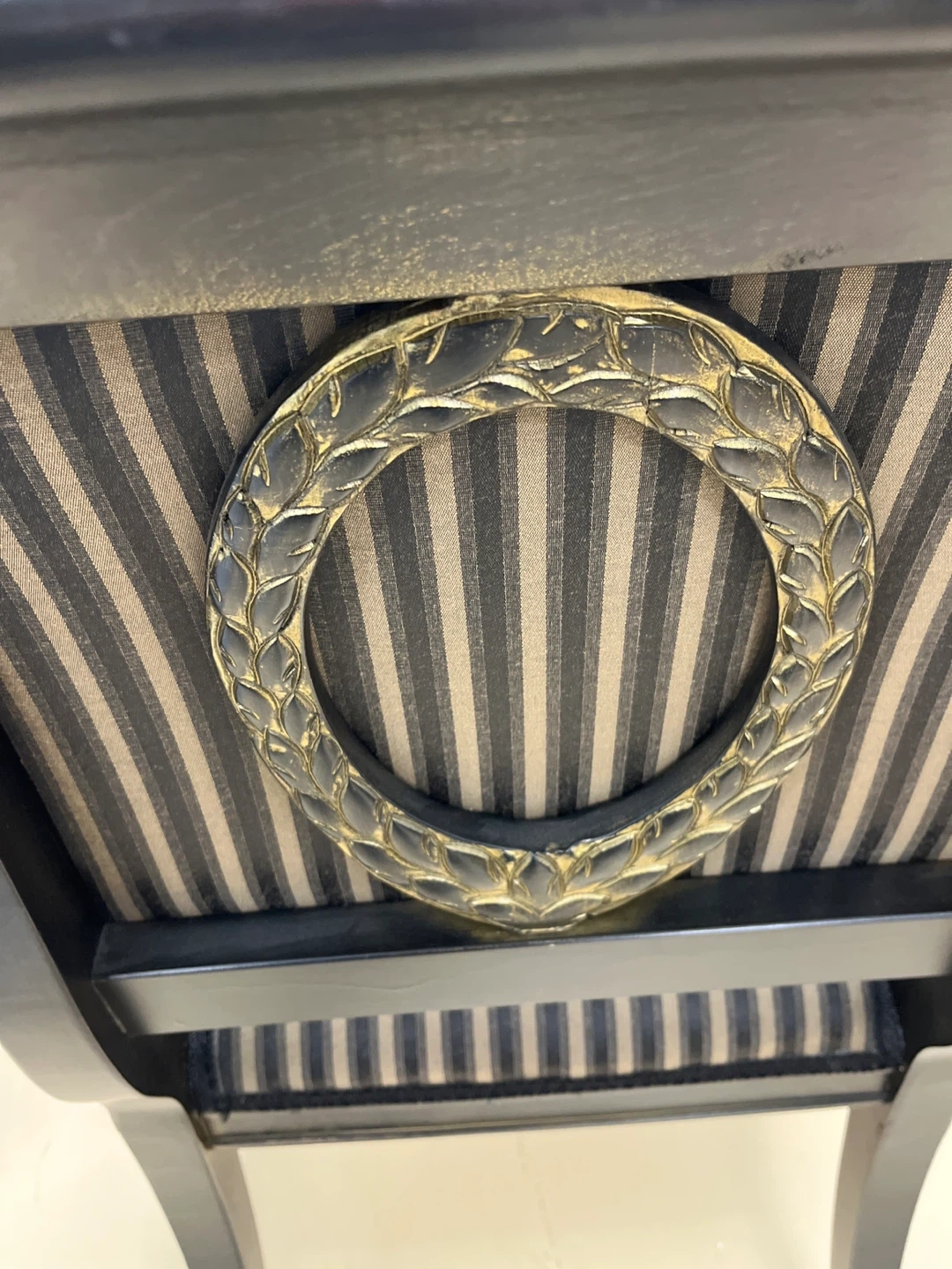 GORGEOUS - very high quality. Selling a set of armchairs with a classic striped pattern. These chairs feature a black frame with gold dusted accents and a unique filagree & wreath design on the back. They would make a great addition to any living space!