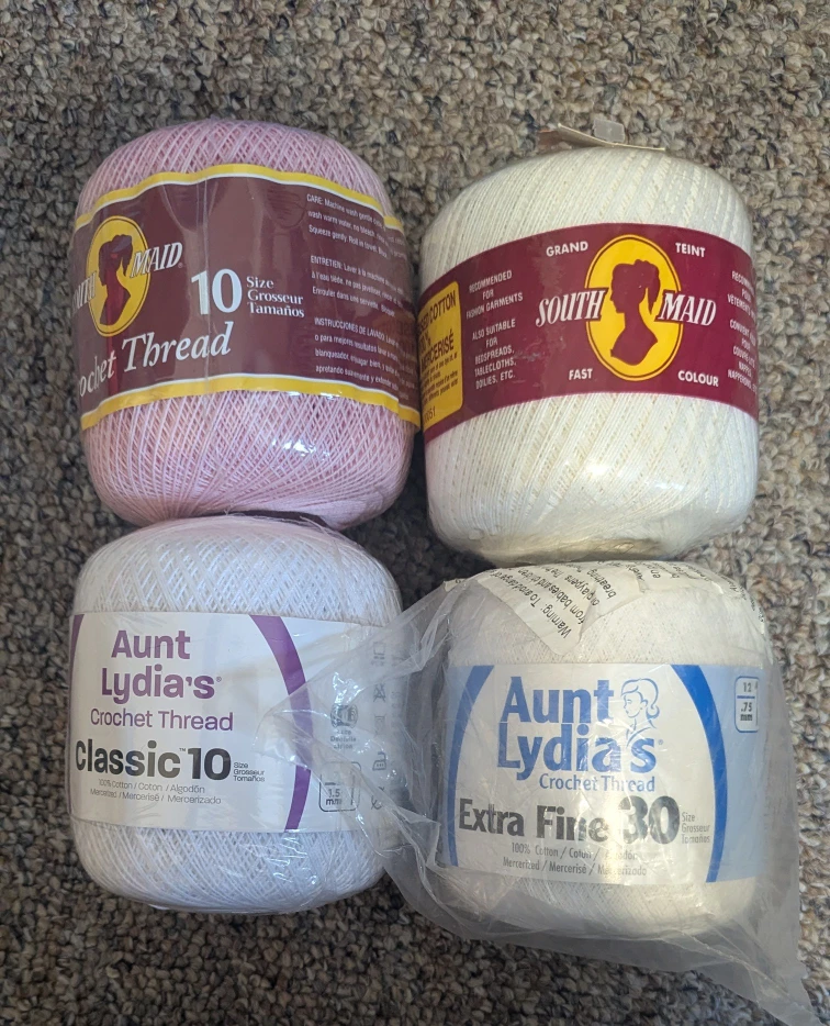 Selling a lot of crochet thread including Aunt Lydia's Classic 10, Aunt Lydia's Extra Fine 30, South Maid, and Aunt Maid. Perfect for your crafting projects!