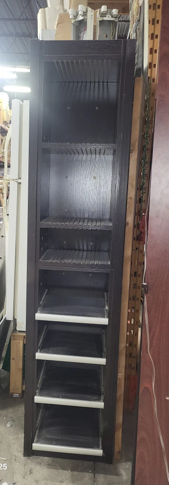 Selling a dark brown wooden shelf unit. It has 3 stationary shelves and 4 slide out drawers for storage. Solid piece. Great for organizing your space!