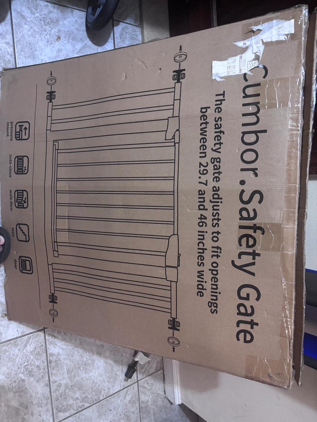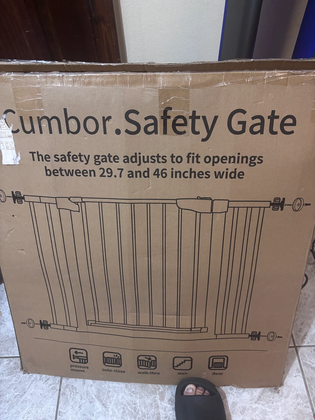 Selling a brand new Cumbor Safety Gate still in its original box! This safety gate adjusts to fit openings between 29.7 and 46 inches wide. It features pressure mount, auto-close, walk-thru, stair, and door functions. Perfect for keeping your little ones safe!