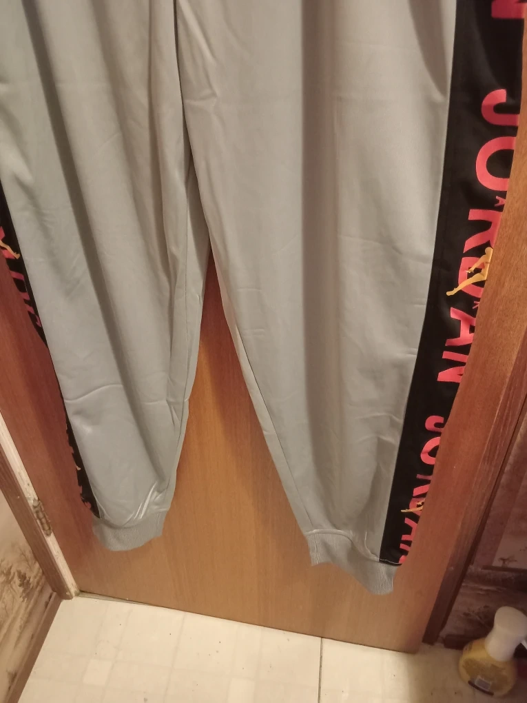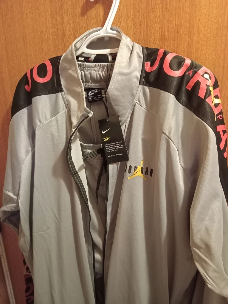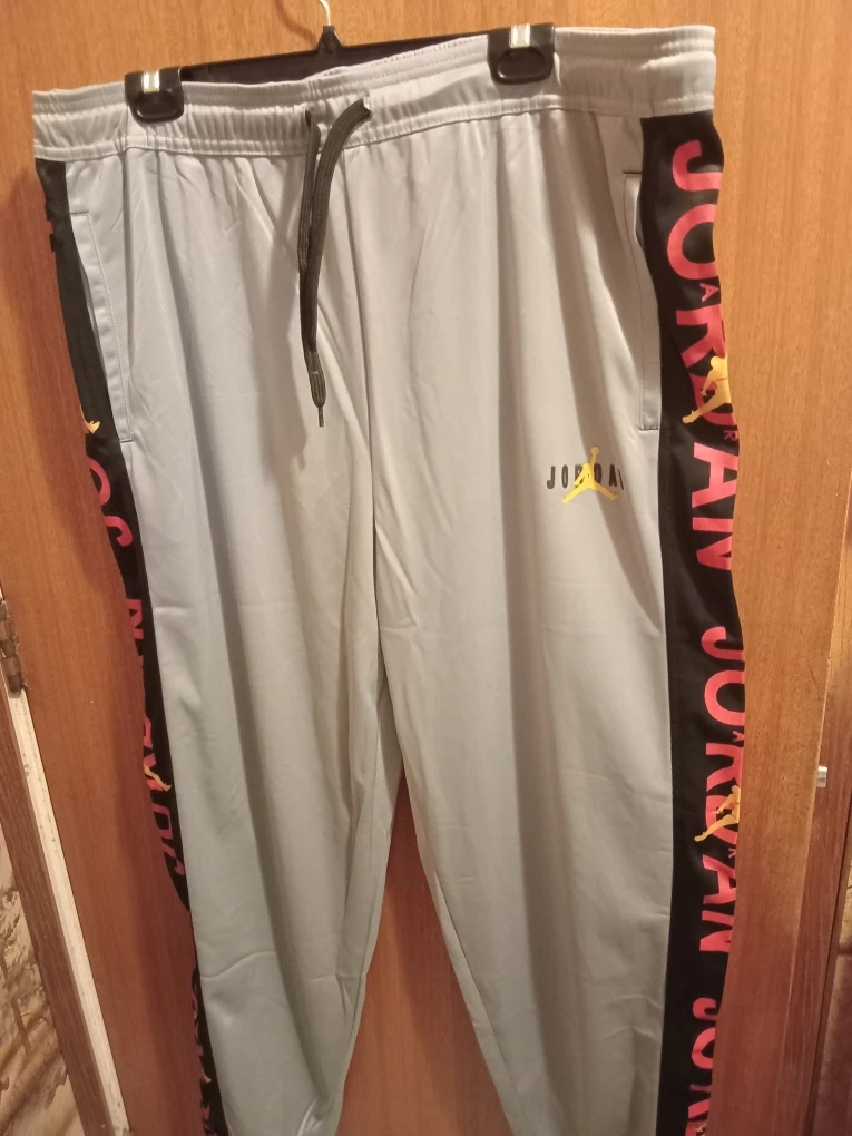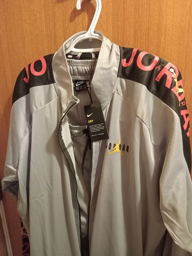 Selling a Nike Jordan tracksuit in size 4XL. Fits small, maybe 2xl, main reason for selling. It's a stylish grey colour with black and red accents. Perfect for workouts or casual wear!