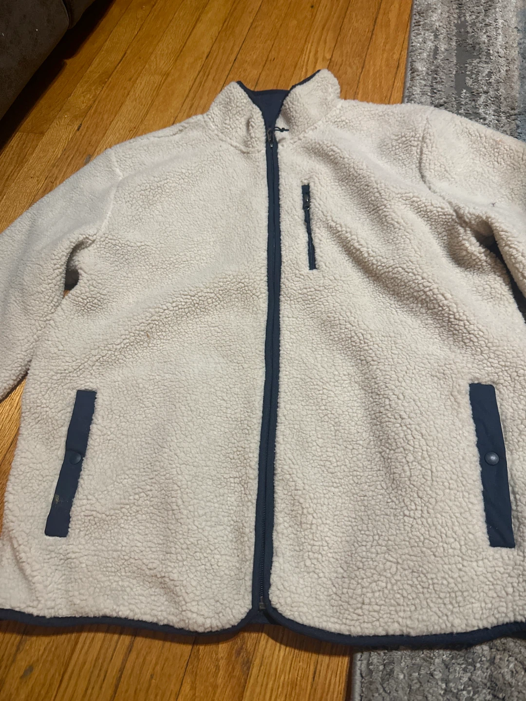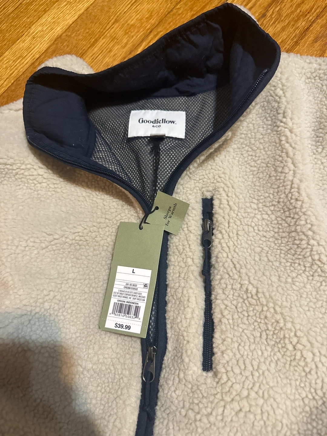 Here's a cozy sherpa fleece jacket from Goodfellow & Co! It's a size large and features a full zip front with a contrasting navy blue trim. The jacket has a soft, plush texture and a convenient chest pocket with a zipper. Originally bought for $39.99!
