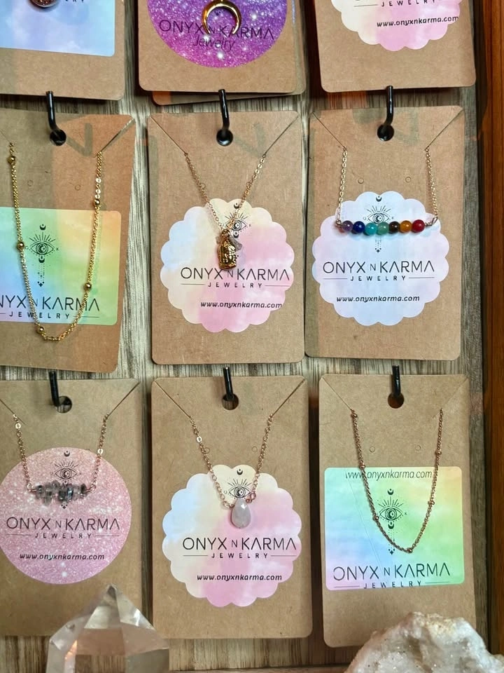 Crafted with Spirit. Worn with Purpose. Onyx n Karma was born from a love for all things intentional — healing crystals, celestial energy, and self-expression through adornment. Each piece is handmade with care, using quality metals and genuine gemstones chosen for their energetic properties as much as their beauty. We believe jewelry should do more than accessorize — it should empower, protect, and remind you of your worth and purpose. Whether you're wearing a hand-stamped mantra close to your heart or layering a stack of crystal bracelets for energy alignment, you're not just wearing jewelry — you're wearing meaning. Every design is infused with the belief that the universe has your back and your journey is sacred. Onyx n Karma is here to help you shine from within.