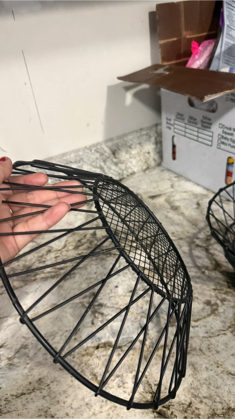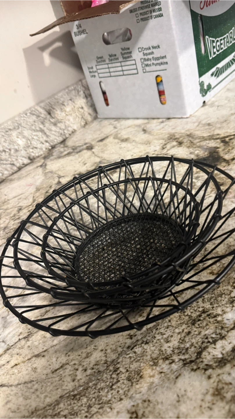 Good Selling a set of three black wire baskets! They're perfect for organizing fruit, vegetables, or other household items. They nest together for easy storage when not in use. They are in good condition and ready for a new home!