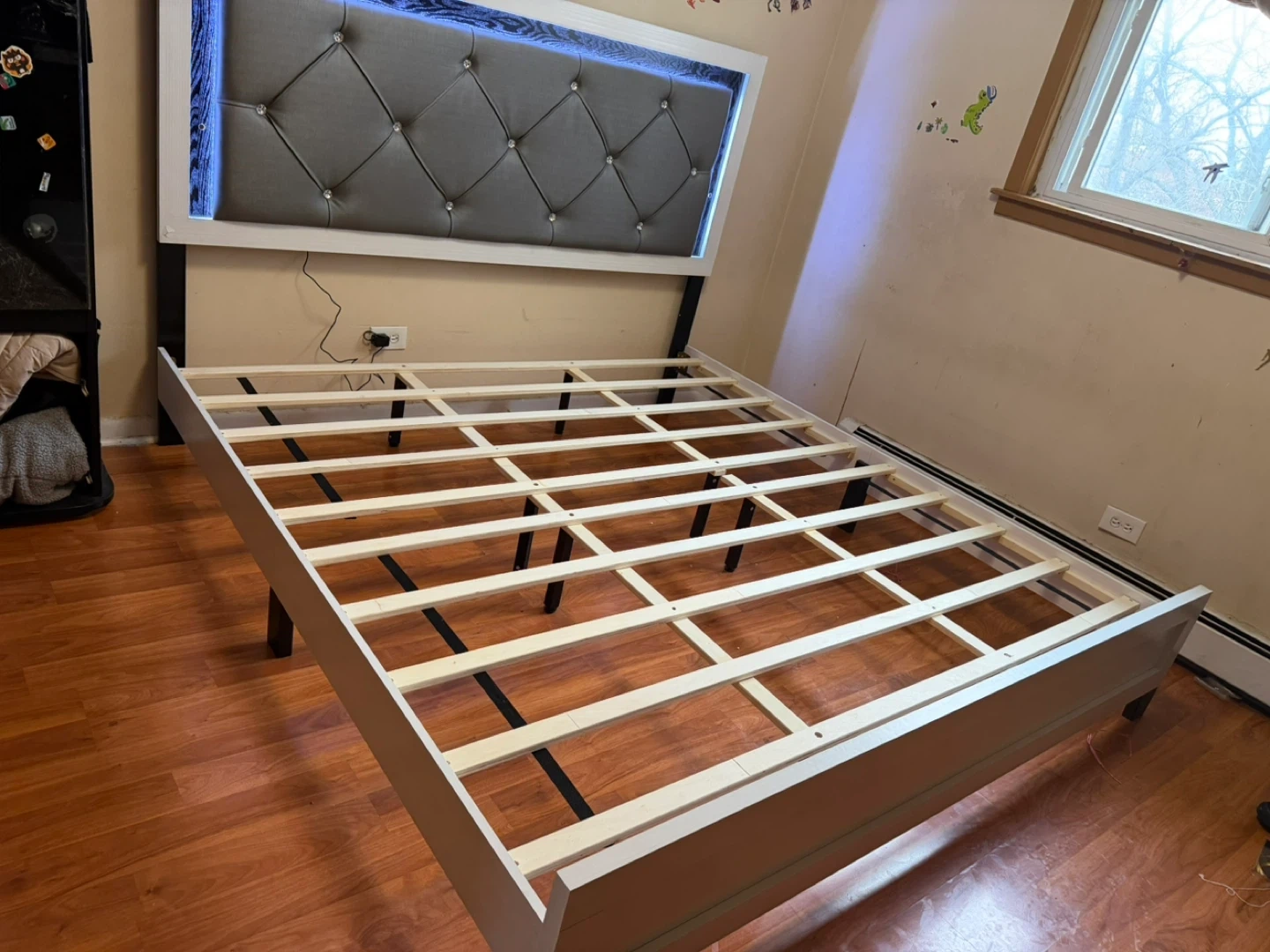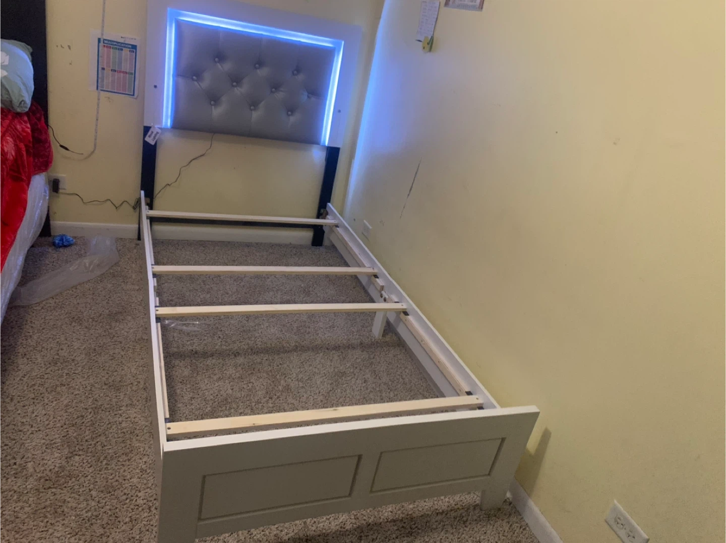 Selling a twin bed frame that features a stylish LED headboard. The headboard has a tufted design and the bed frame is a clean white color. It's in great condition and ready for a new home!