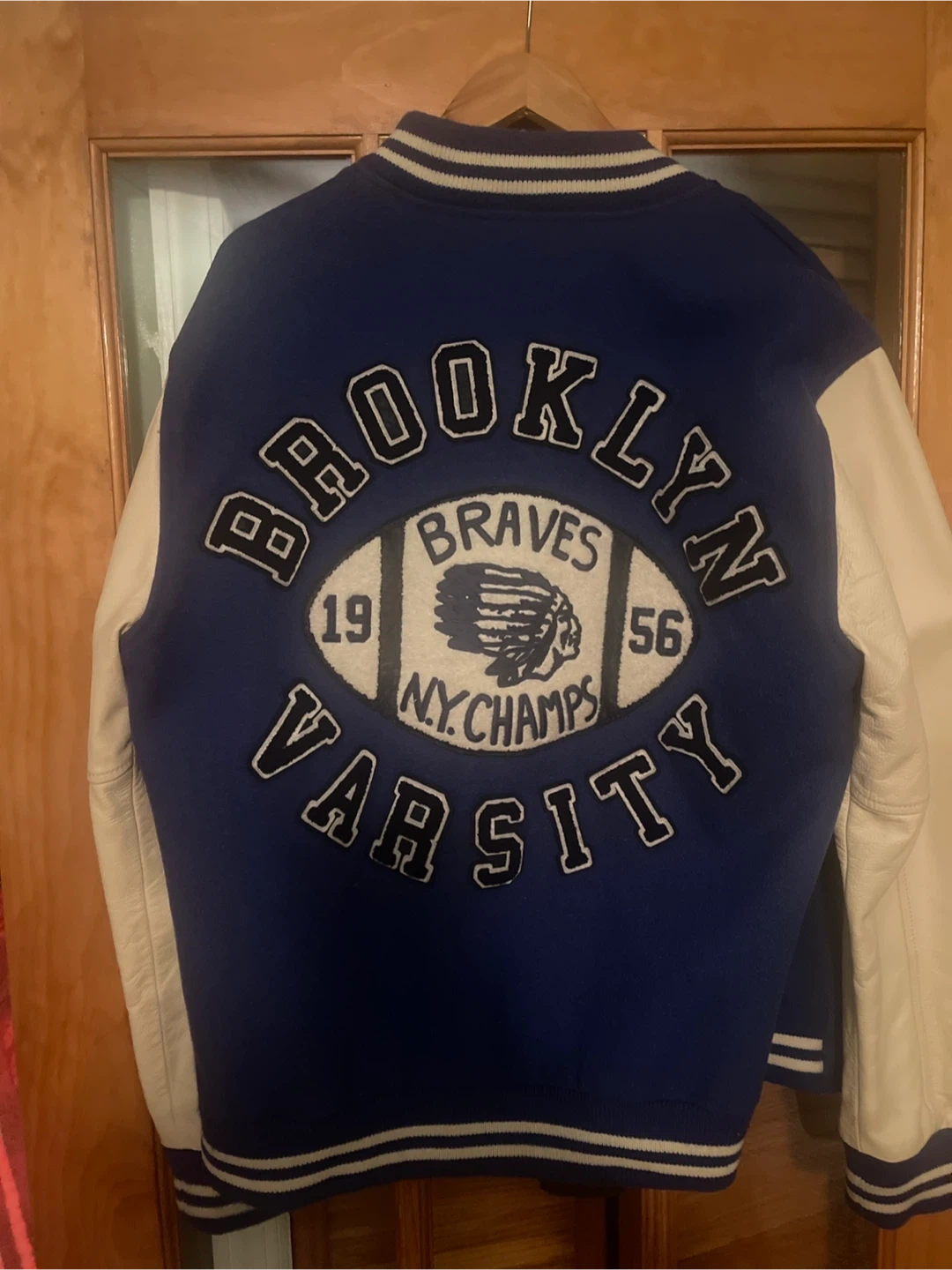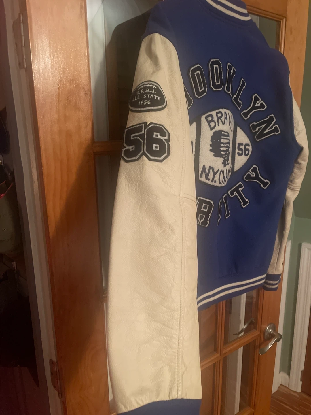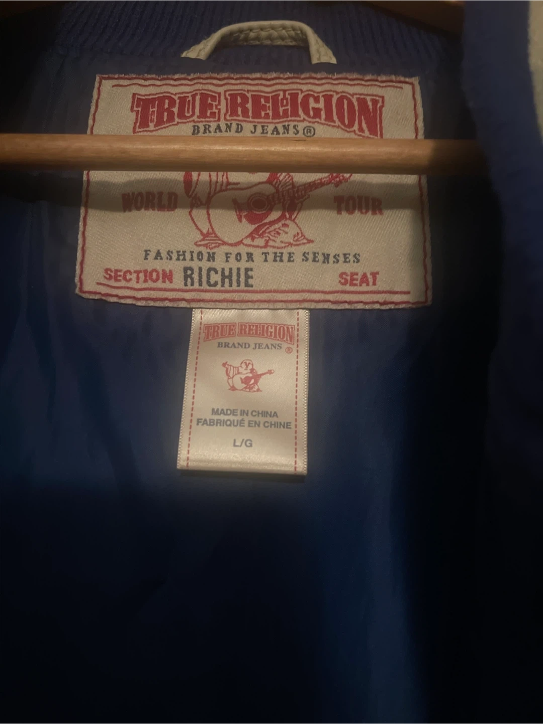 Selling a True Religion varsity jacket in size L/G. It features a blue and white color scheme with "BROOKLYN VARSITY" lettering on the back. The jacket has a vintage feel with patches and embroidered details. It's in good condition and ready for a new owner!