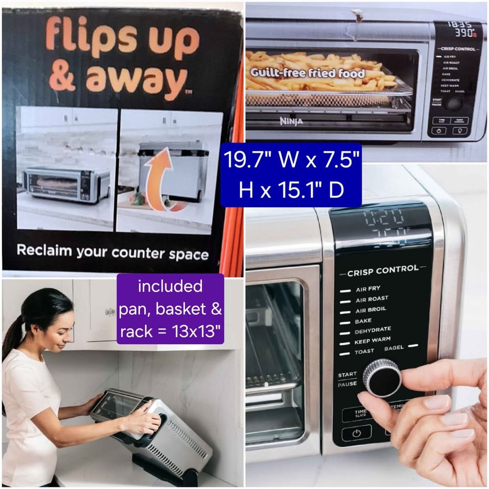 1800 watt air fry oven with digital crisp control, 13x13" sheet pan, 13x13" air fry basket, 13x13" wire rack and removable crumb tray for cleaning - flips up to save counter space when not in use