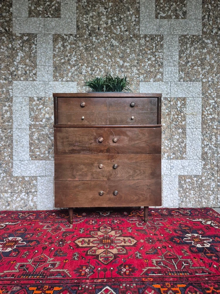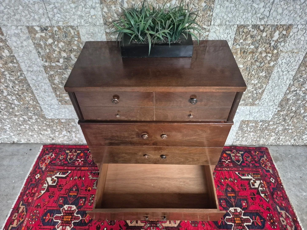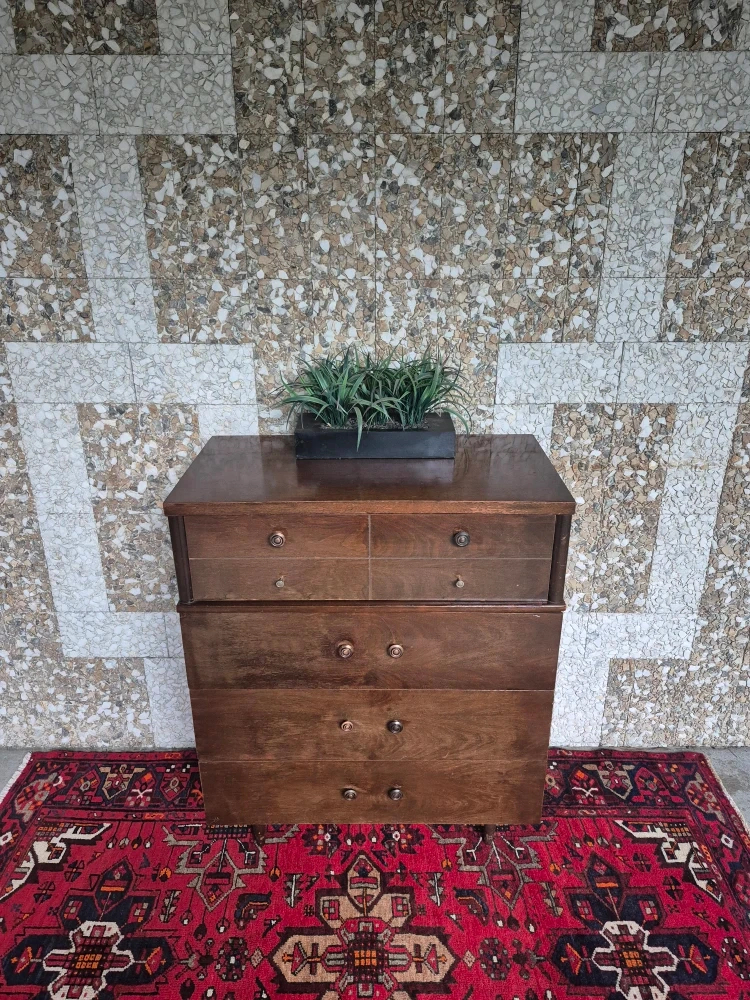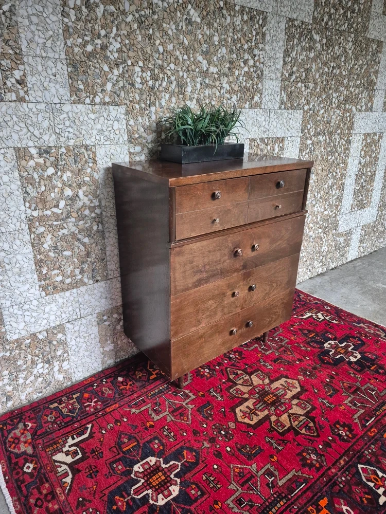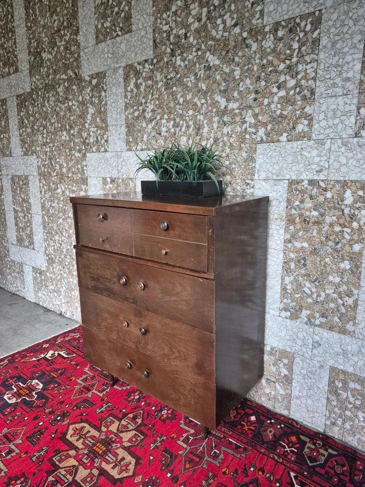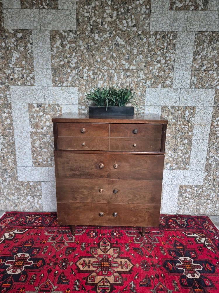 Here's a lovely mcm dresser with four drawers. It's perfect for adding some extra storage to any room. The dresser has a beautiful wood grain and a classic design that would fit well with many decor styles. There are signs of wear, but it's still in good vintage condition and ready to use!