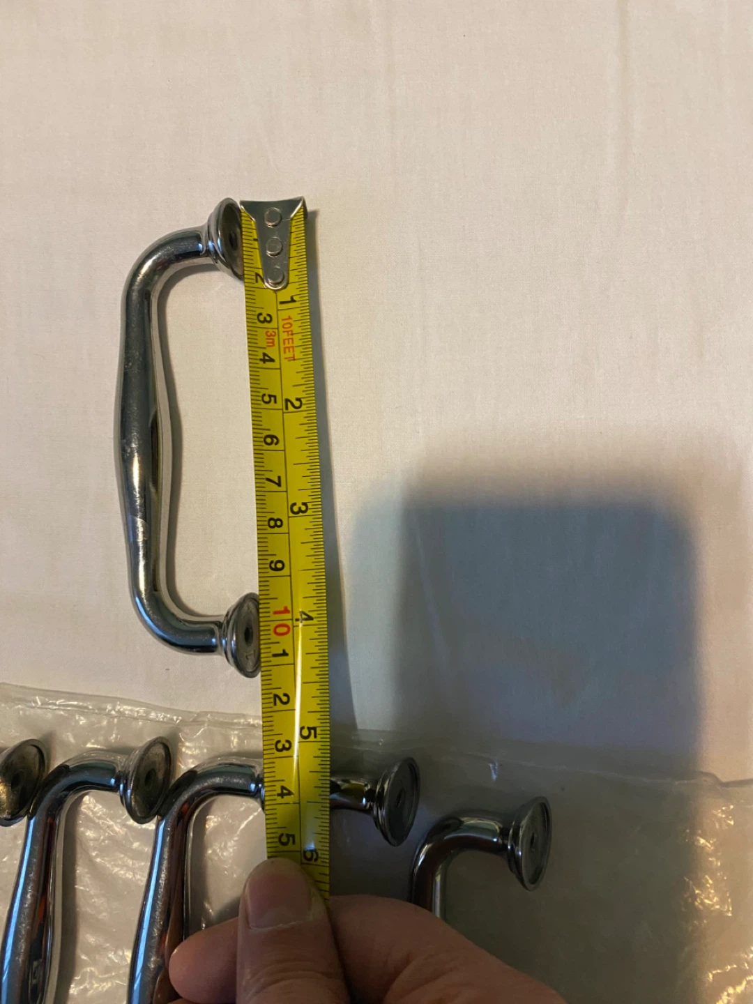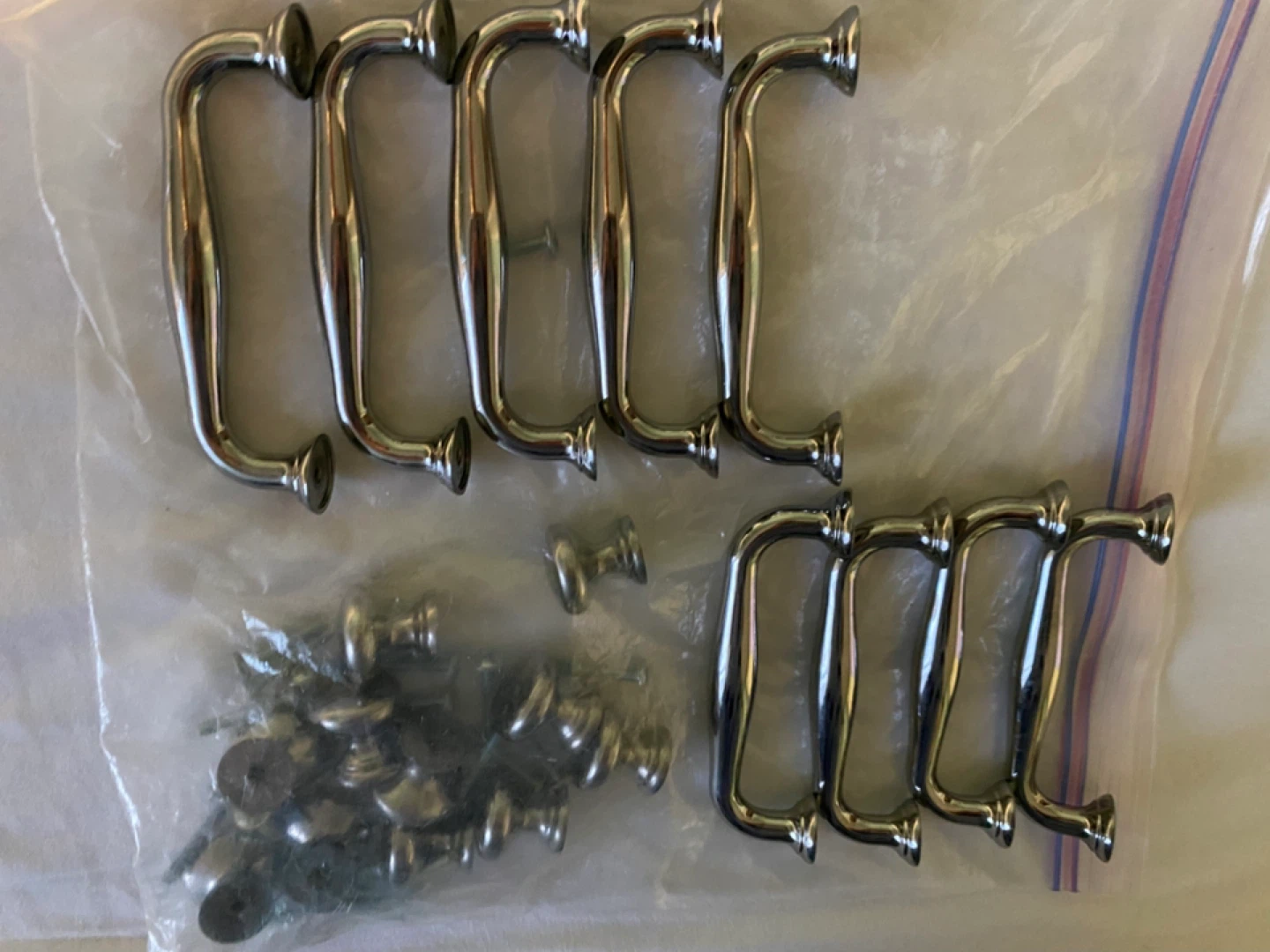 Selling a set of 9 metal drawer pulls. They're in great shape and come with all the screws you need for installation. Each pull measures approximately 4 inches in length.