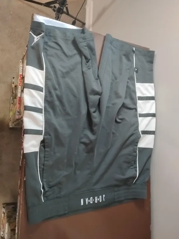 Selling a pair of Jordan Dri-FIT pants in size medium. They're grey with white stripes on the sides. The material is Dri-FIT, so they're great for workouts or just lounging around!