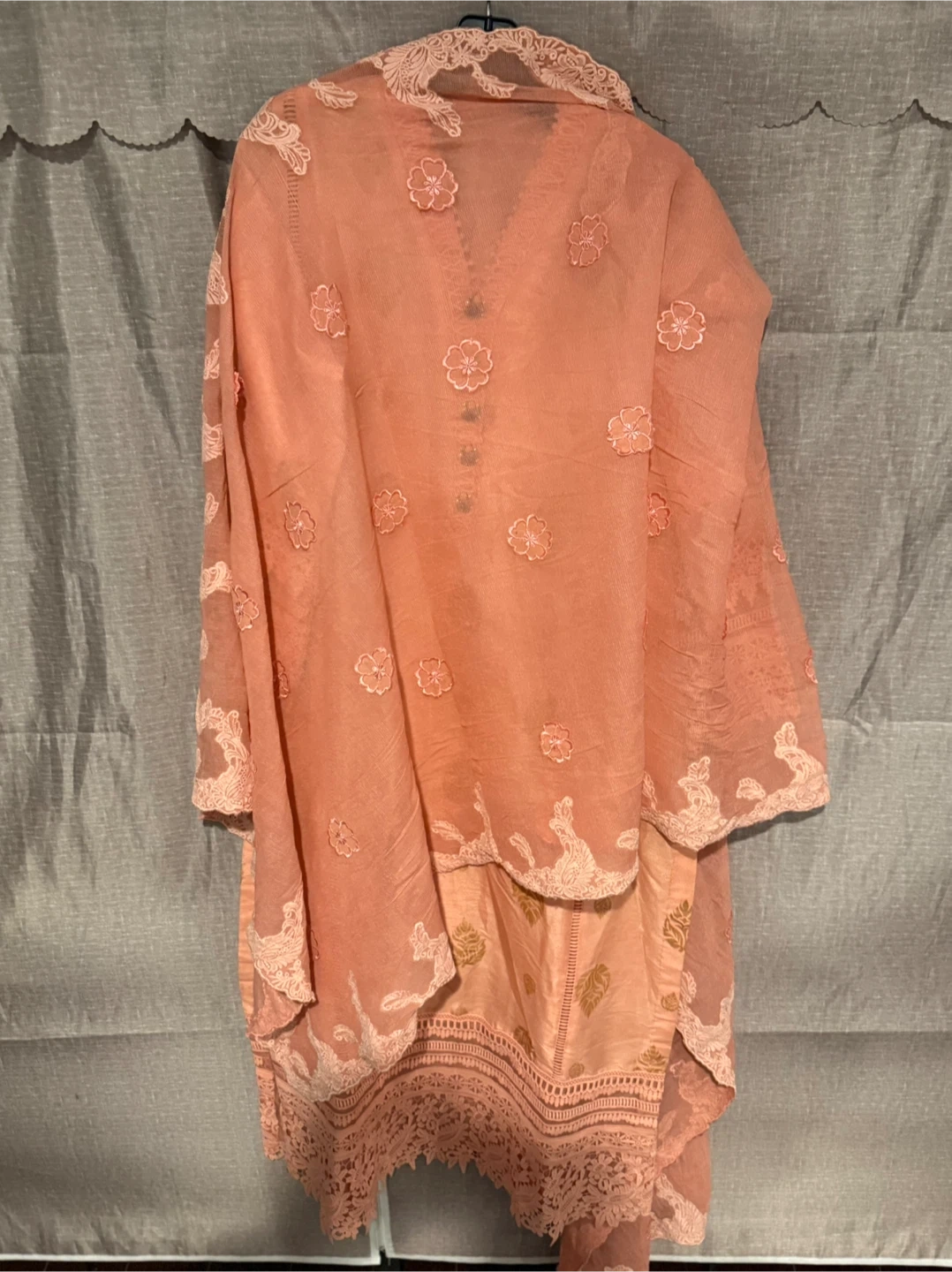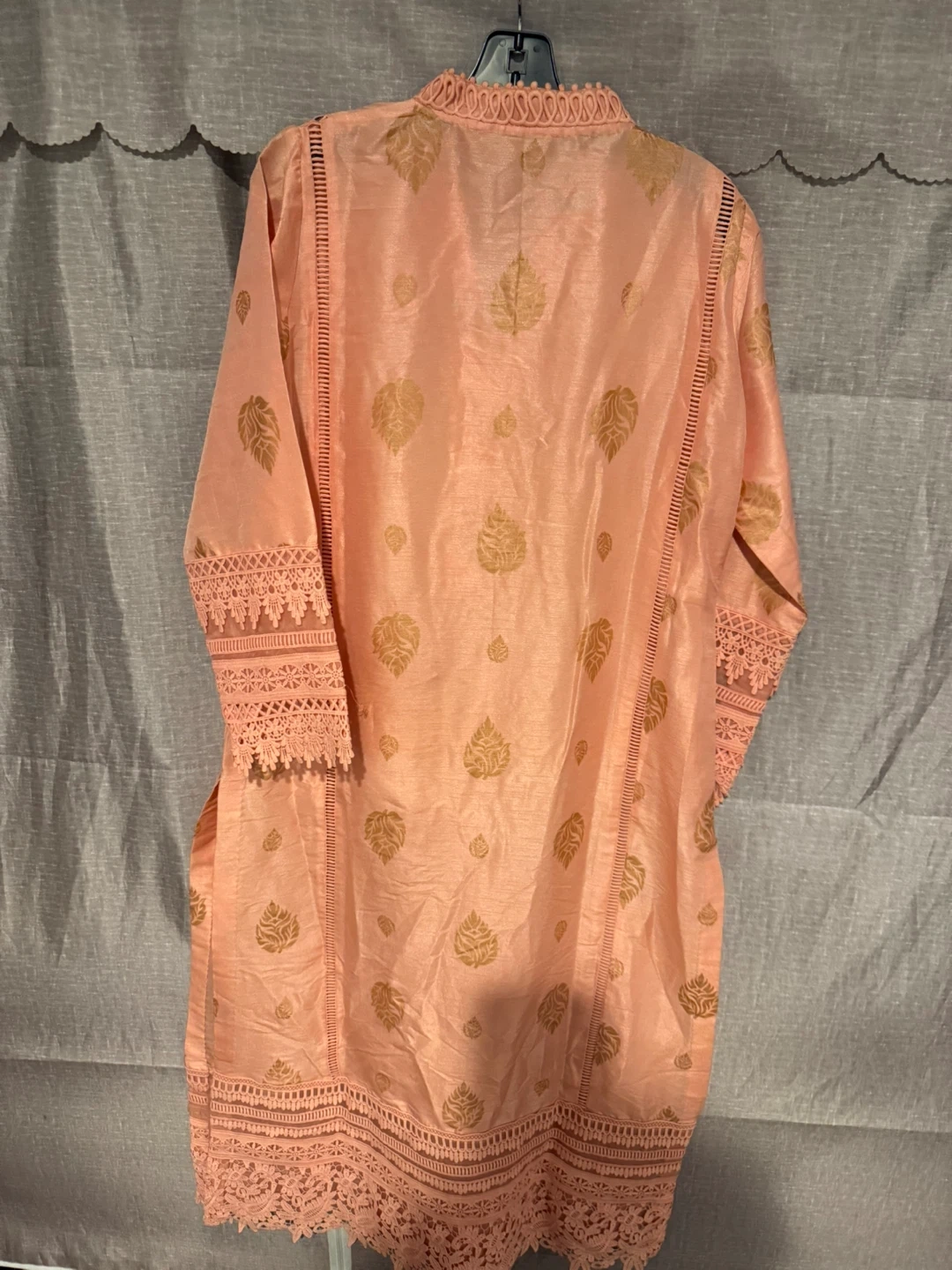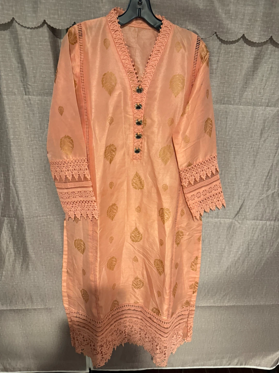 Beautiful peach-coloured shalwar kameez suit with gold leaf detailing and intricate lace trim. Perfect for special occasions or everyday wear!