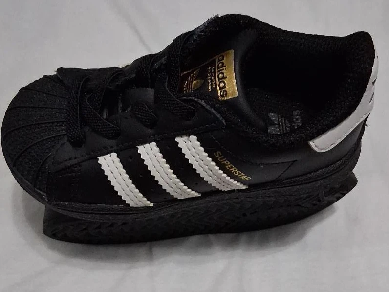Selling a pair of Adidas Superstar sneakers in black! They feature the classic three white stripes on the side. Great for kids!