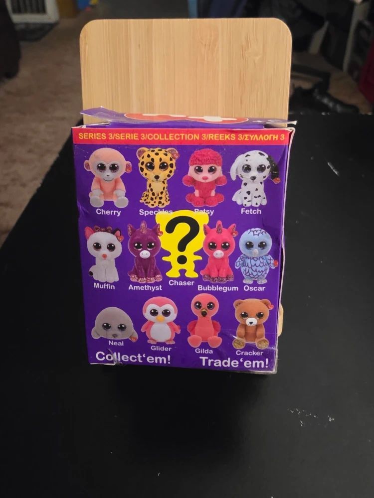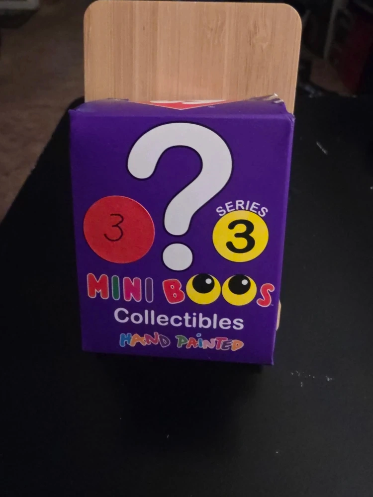Selling a box of Ty Mini Boos Collectibles from Series 3! These hand-painted figures are super cute and fun to collect. The box shows all the possible characters you could get, like Cherry, Speckles, Daisy, Fetch, and many more!