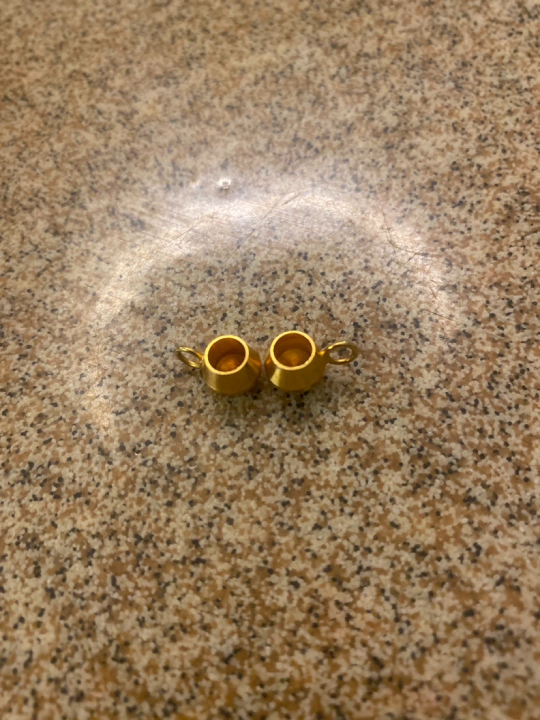 Here are two small gold-coloured charms. They appear to be miniature cups or containers with a loop for attachment. Perfect for adding a touch of shine to your crafts or jewellery projects!