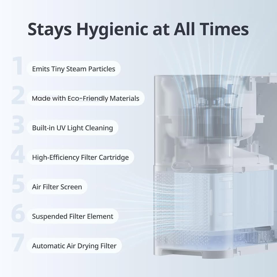 * UV Cleaning Module for Fresher Humidification: This large-room humidifier features an upgraded UV cleaning module, it keeps the water fresh and ensures a cleaner, more consistent humidification experience for your home.