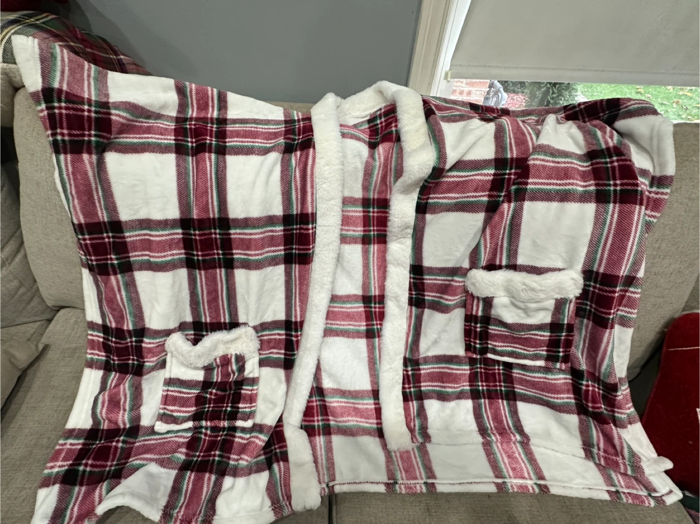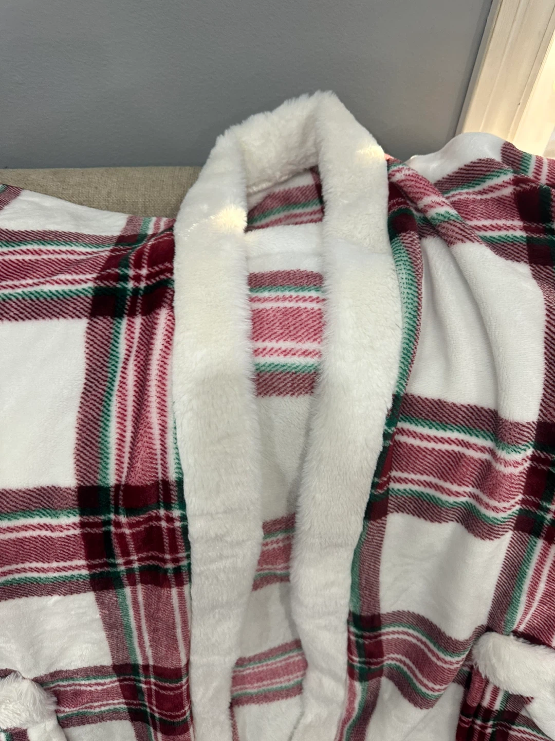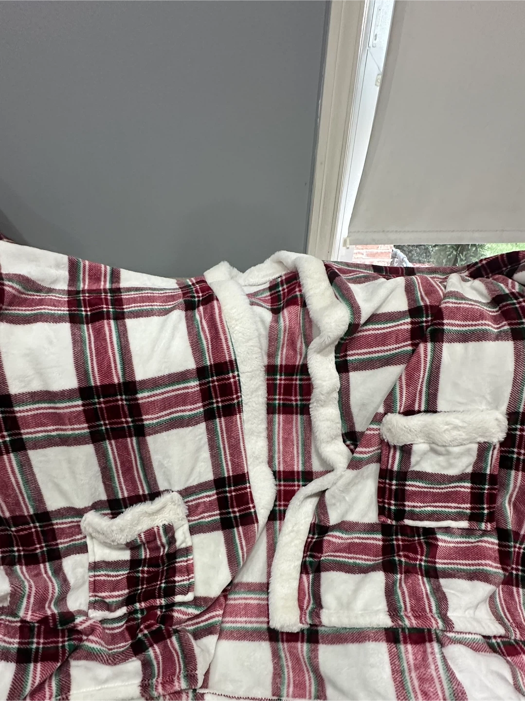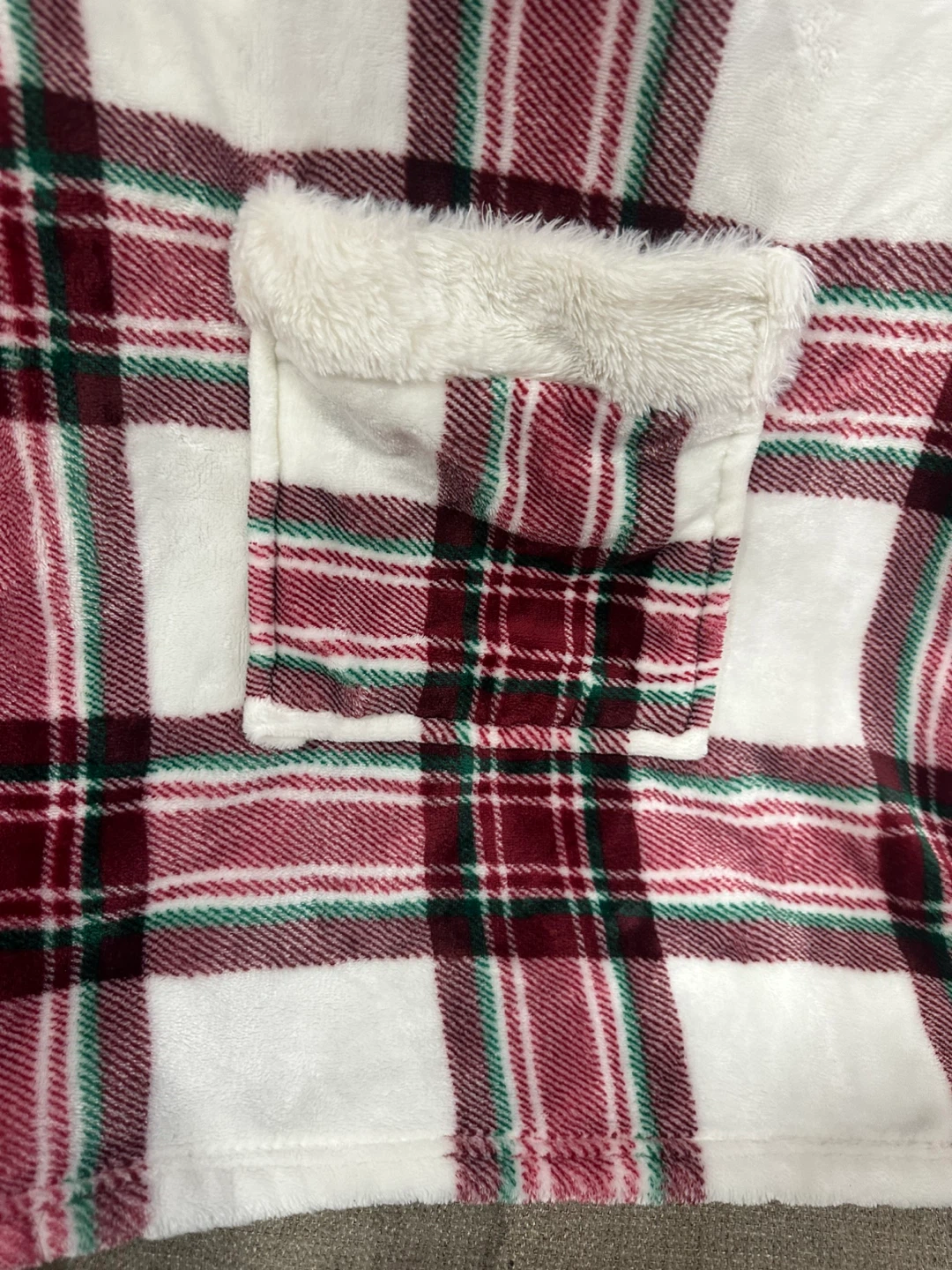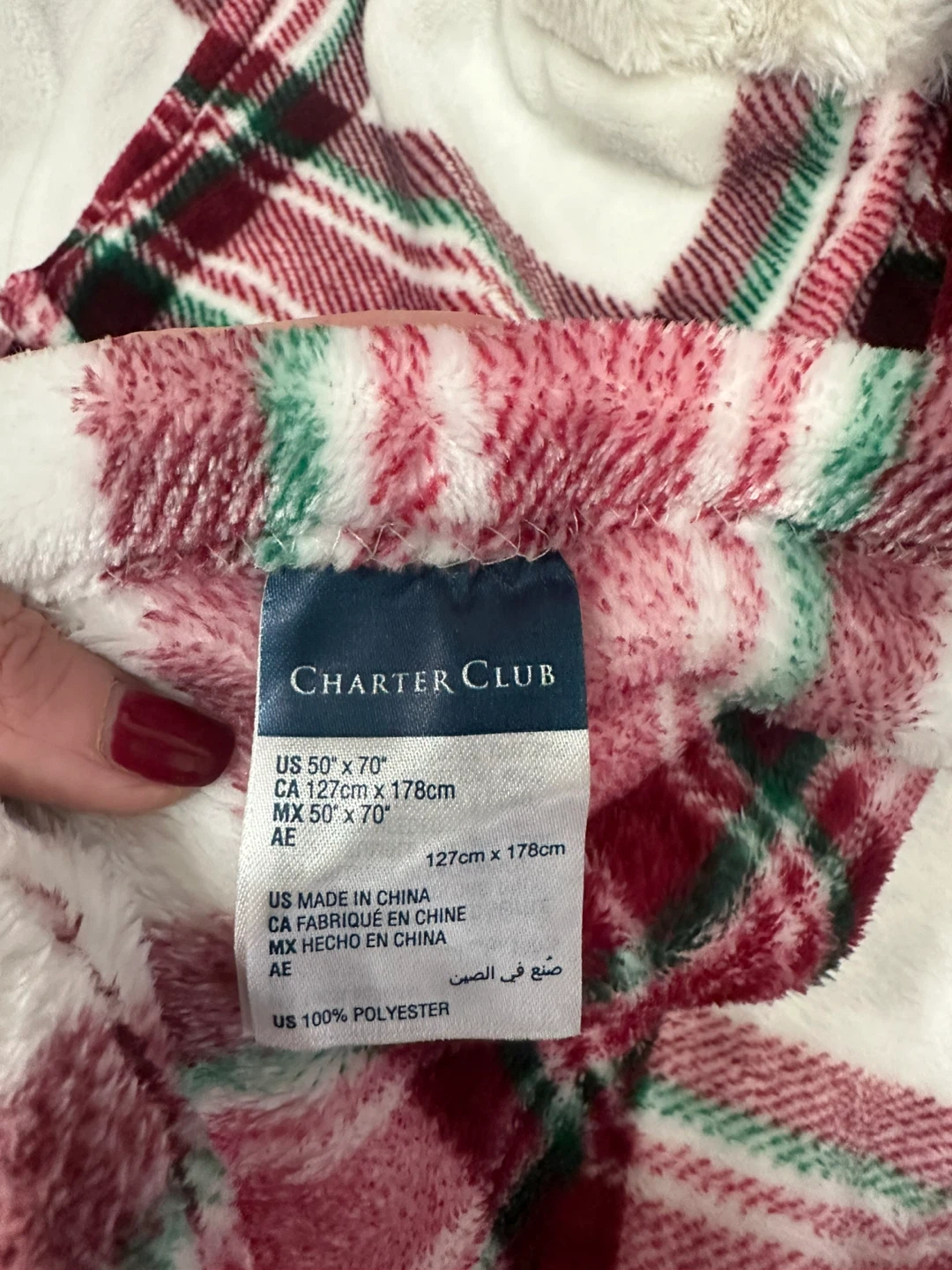 Snuggle up with this cozy Charter Club throw blanket! It features a classic plaid pattern in red, green, and white. The blanket is made of 100% polyester and measures 50" x 70". It's in great condition and ready to keep you warm on chilly nights