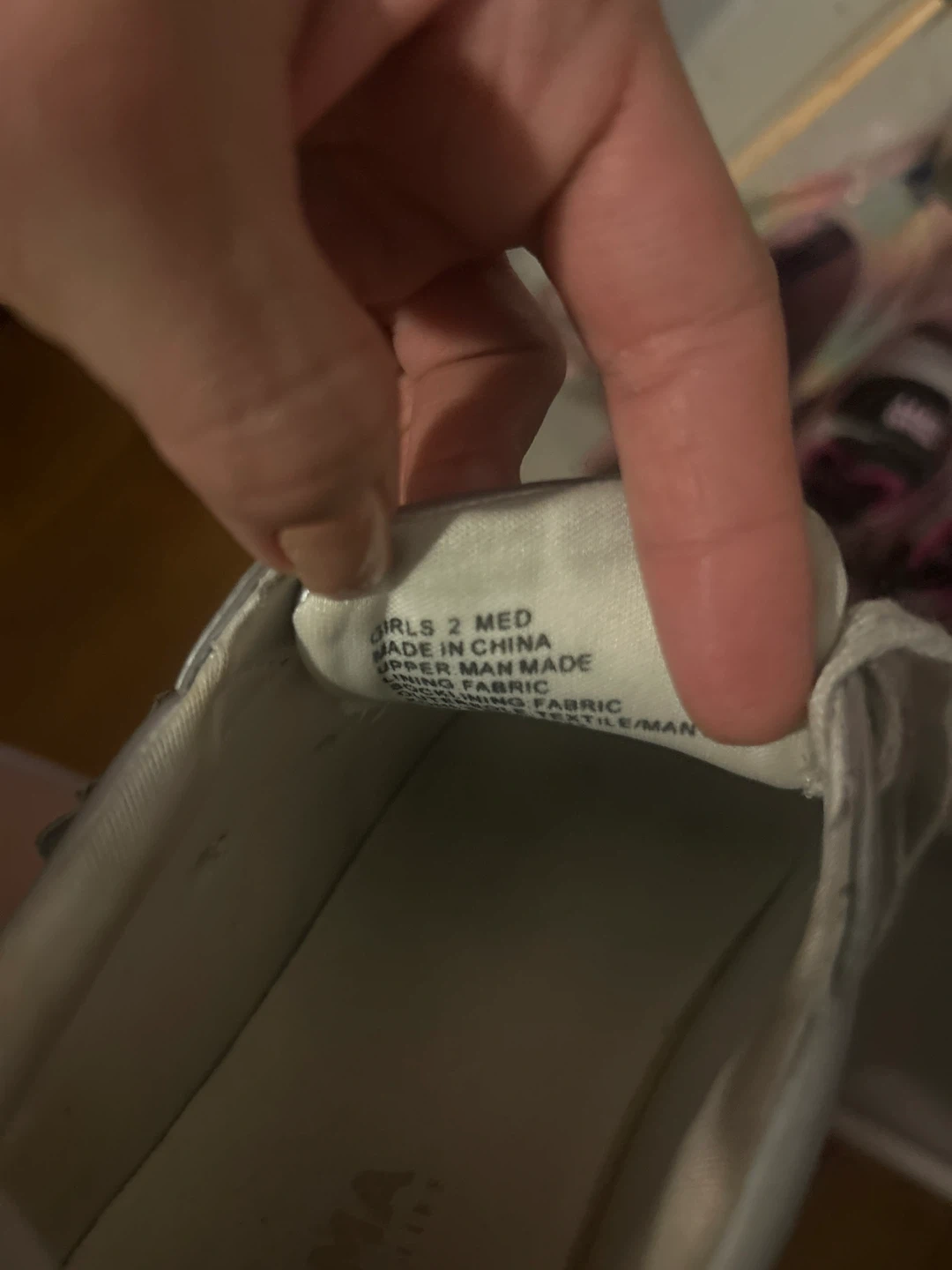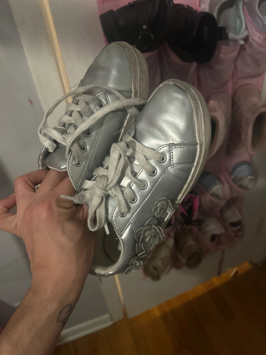 Selling a pair of girls' size 2 silver sneakers. They have a cute floral design on the side. The upper is man-made material and the lining is textile/man-made fabric