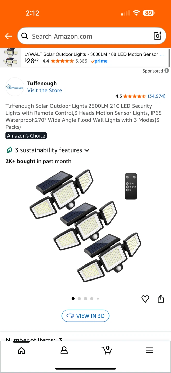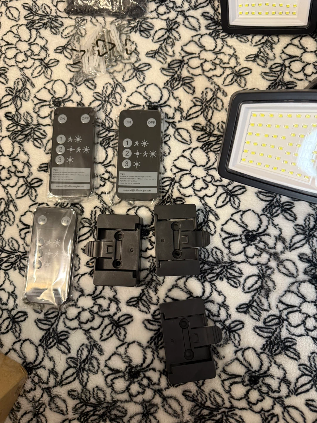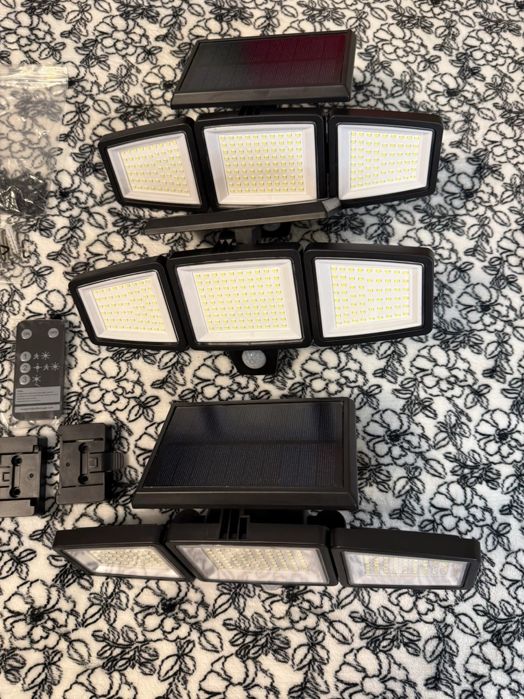 Selling a set of Tuffenough solar outdoor lights! These lights feature 2500LM, 210 LED security lights with remote control, 3 heads motion sensor lights, and are IP65 waterproof. They also have a 270° wide angle flood wall lights with 3 modes. Includes the remote and all components for installation
