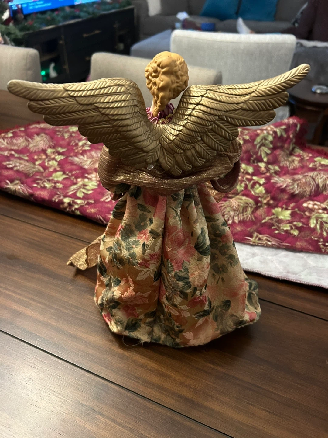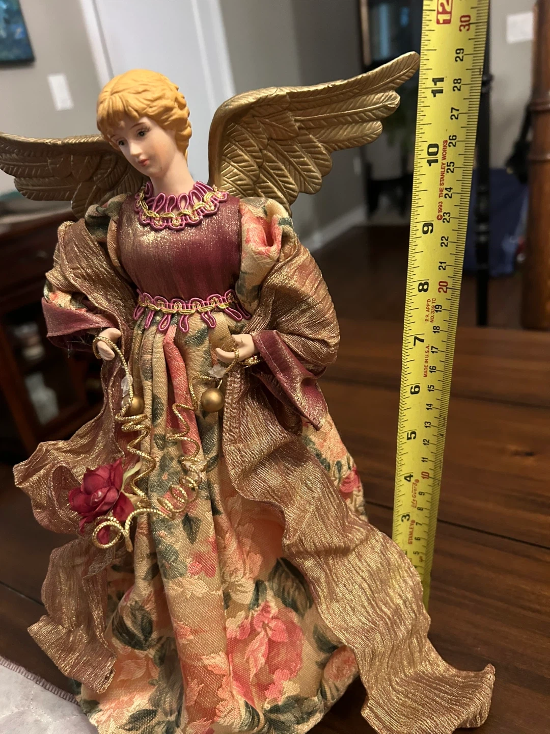 Elegant Angel Tree Topper – Dressed in a lovely floral gown with gold accents.$15
