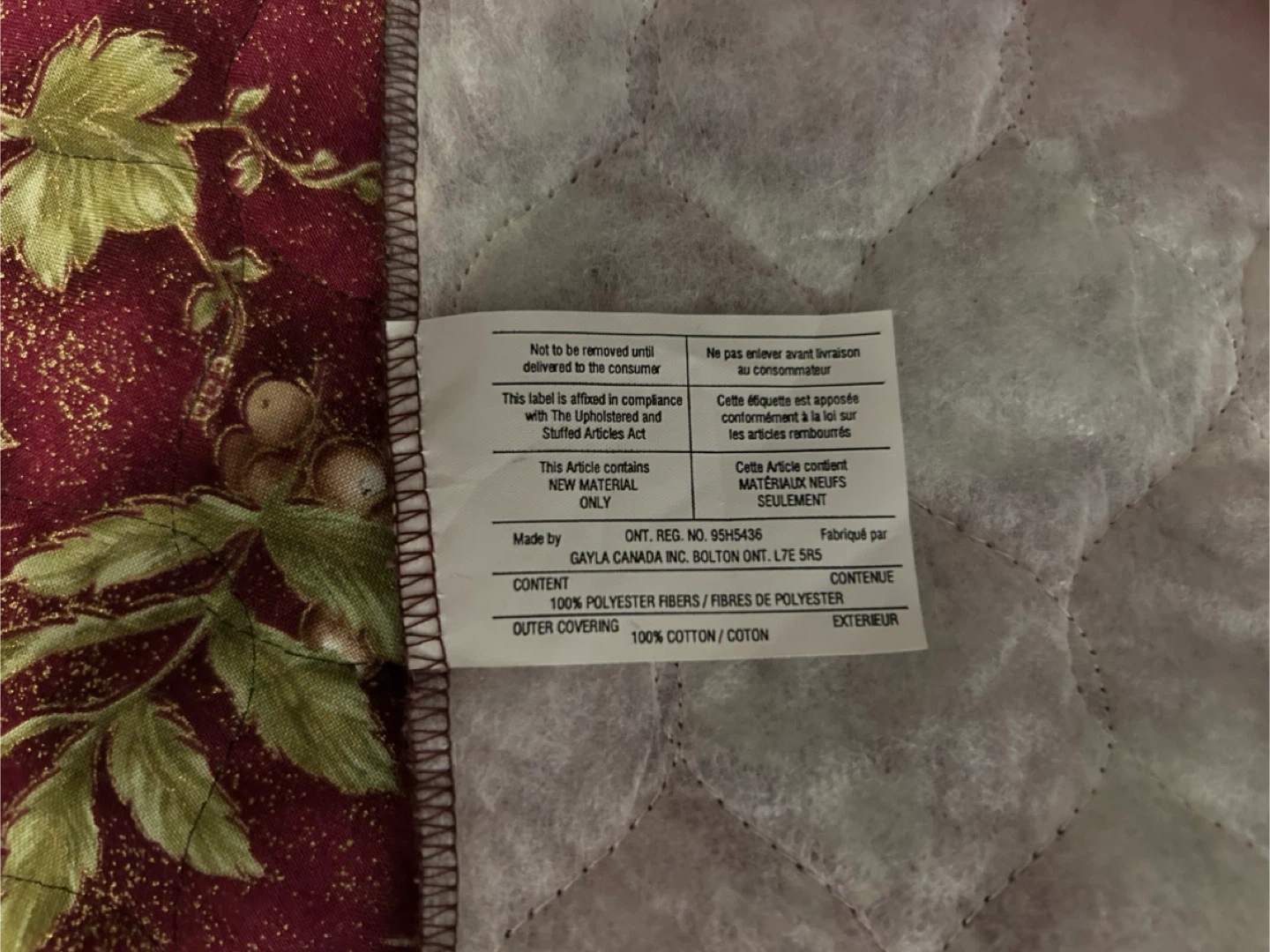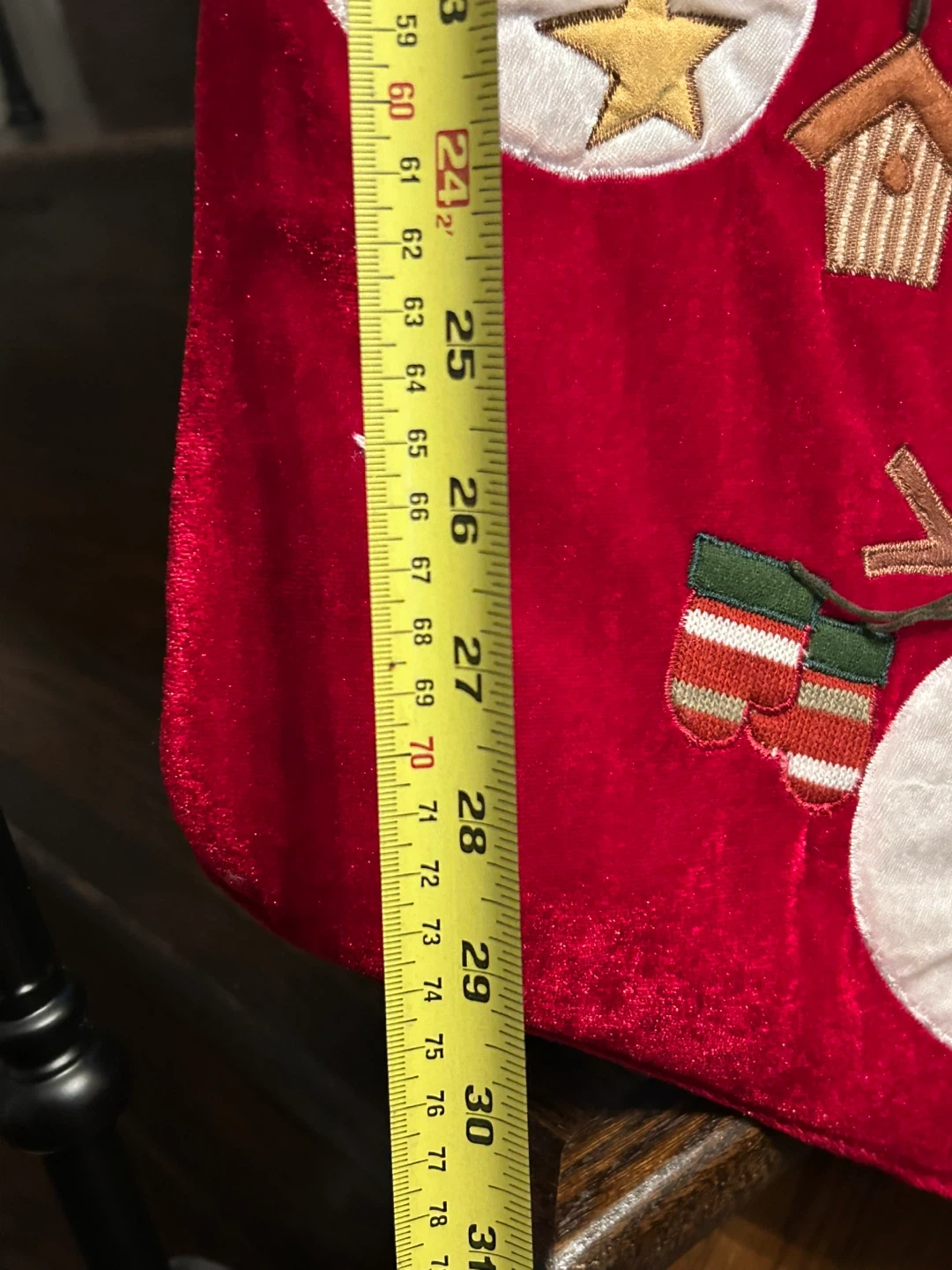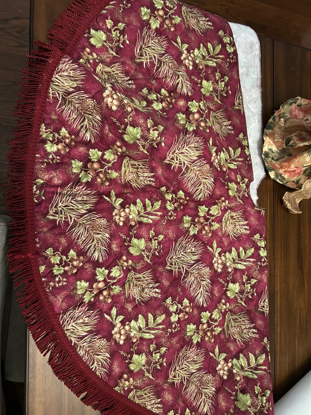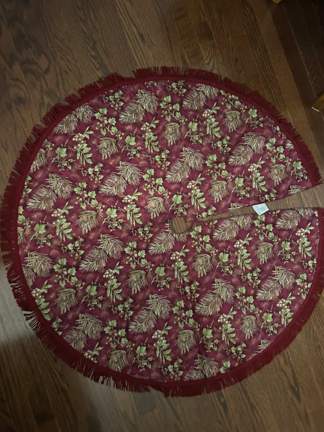 Burgundy Tree Skirt – Features fringe detailing and a festive pinecone and holly design. $10