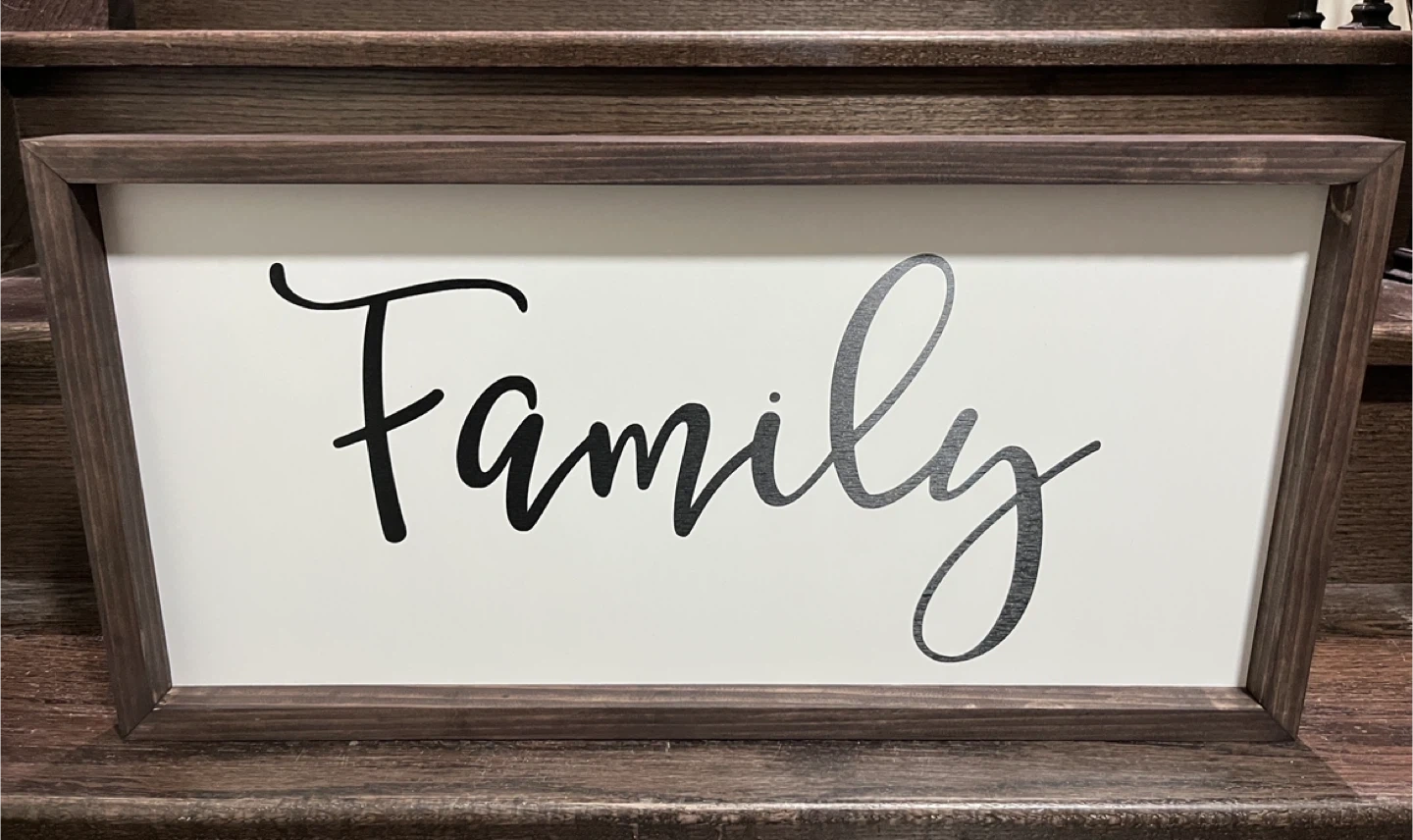 A lovely wood-framed sign with the word 'Family' in elegant script. It's in great condition and would add a warm touch to any room