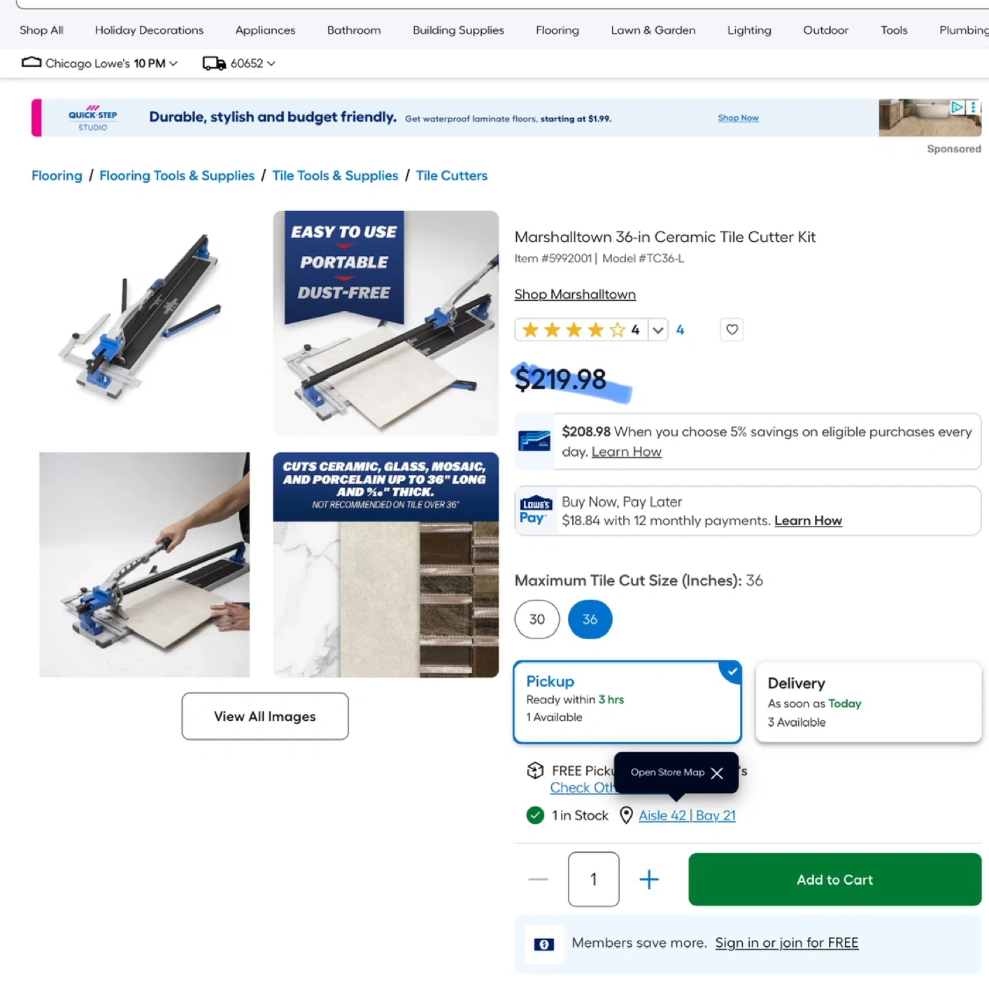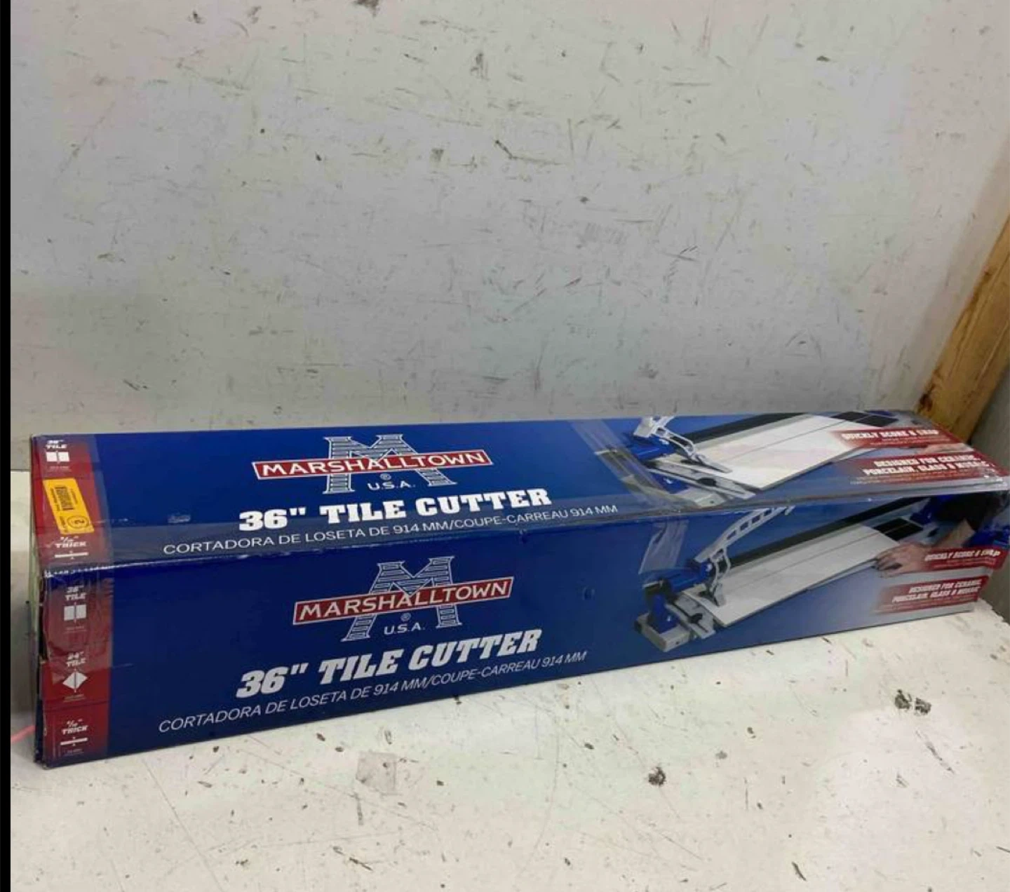 I'm selling a Marshalltown 36-inch ceramic tile cutter kit. It's easy to use, portable, and dust-free. It cuts ceramic, glass, mosaic, and porcelain up to 36" long and 5/8" thick. Originally bought for $219.98. The box is included