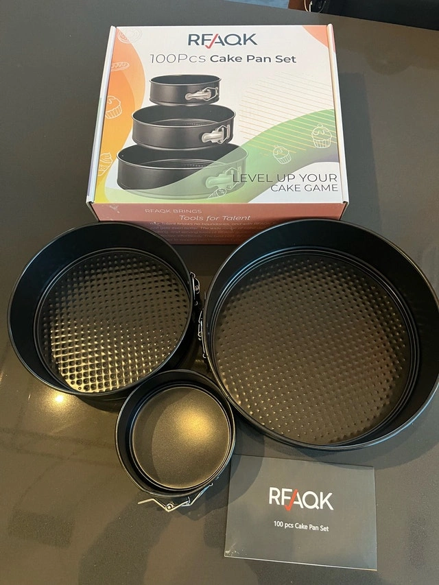 Bake like a pro with this RFAQK Cake Pan Set, designed to help you level up your cake game! This set of cake pans is perfect for creating multi-tiered cakes and desserts. They're in new condition, still in the original packaging and ready for your culinary creations.