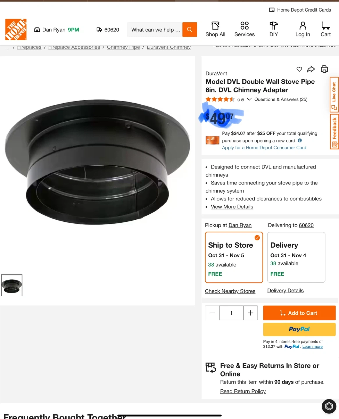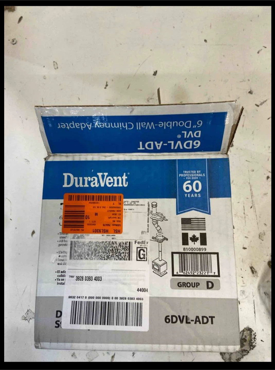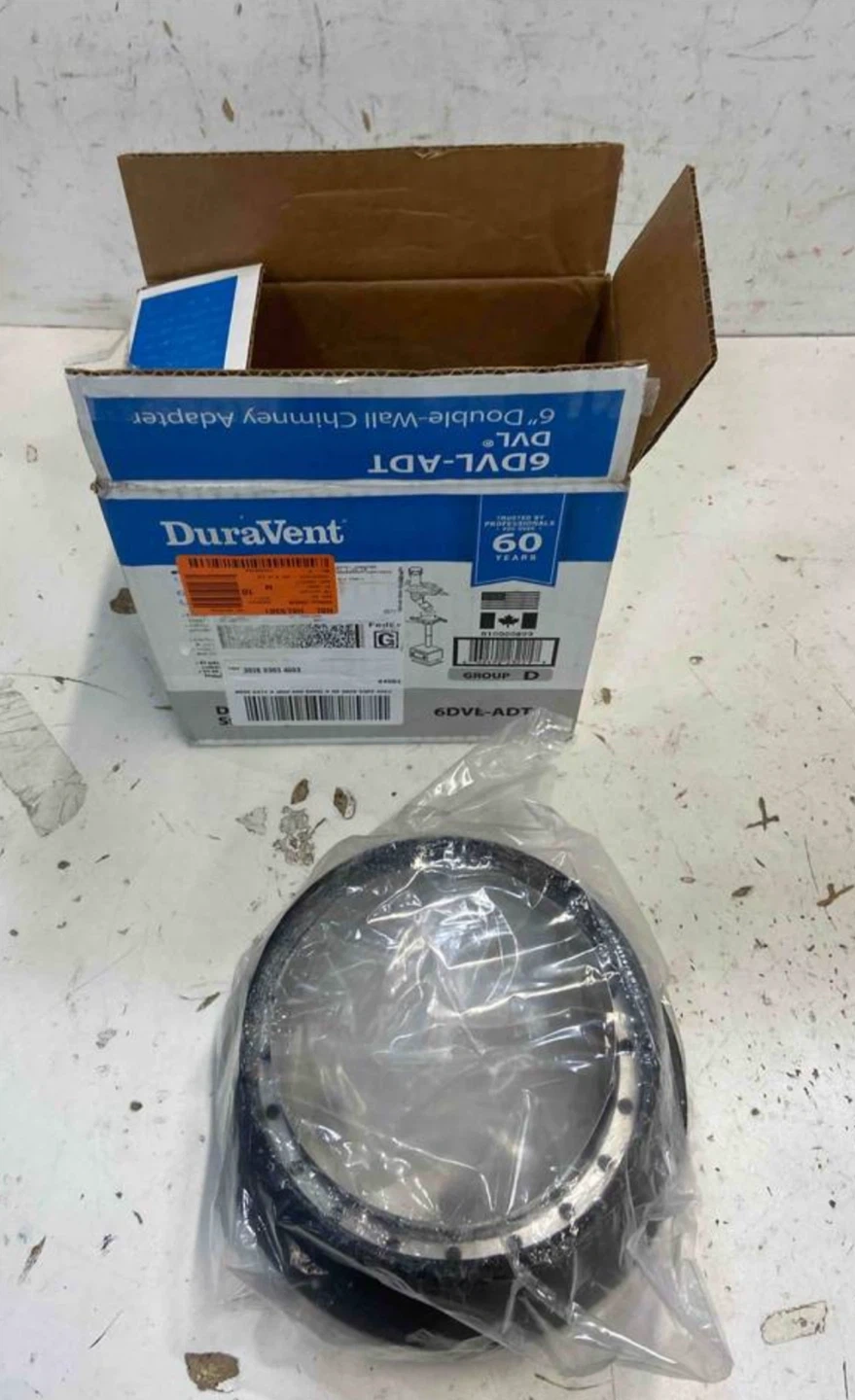Selling a DuraVent 6" Double-Wall Chimney Adapter. It's designed to connect DVL and manufactured chimneys. It saves time connecting your stove pipe to the chimney system. Also, it allows for reduced clearances to combustibles. Box included