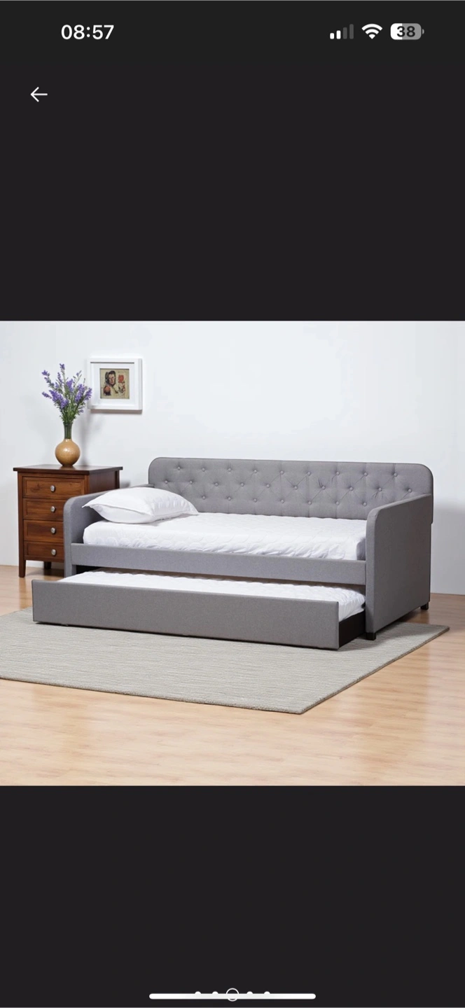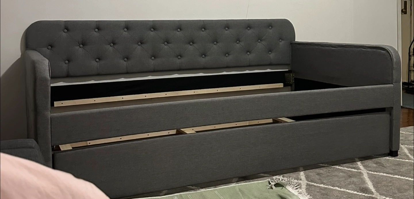 Selling a comfy gray tufted daybed that includes a trundle! It's in great shape and ready for a new home. Perfect for guests or a small space.