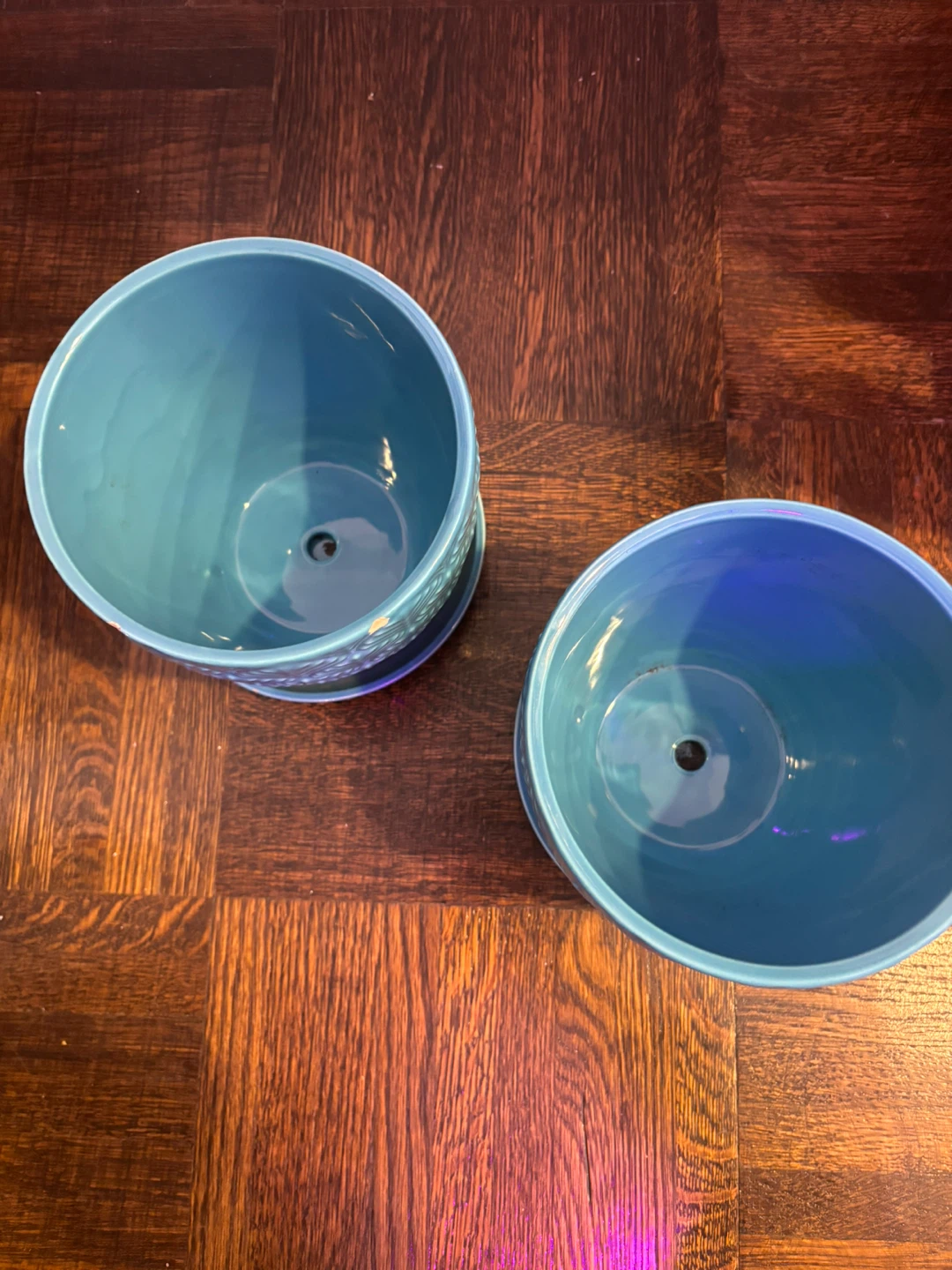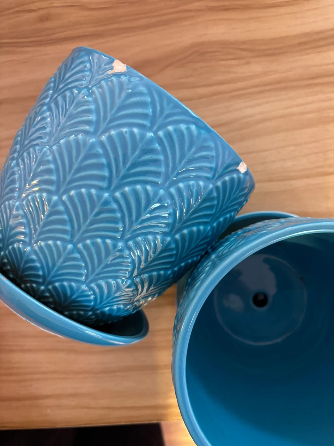 FREE set of two blue ceramic plant pots. They feature a lovely leaf pattern design. Please note there are some chips on the rim of one of the pots, as shown in the photos