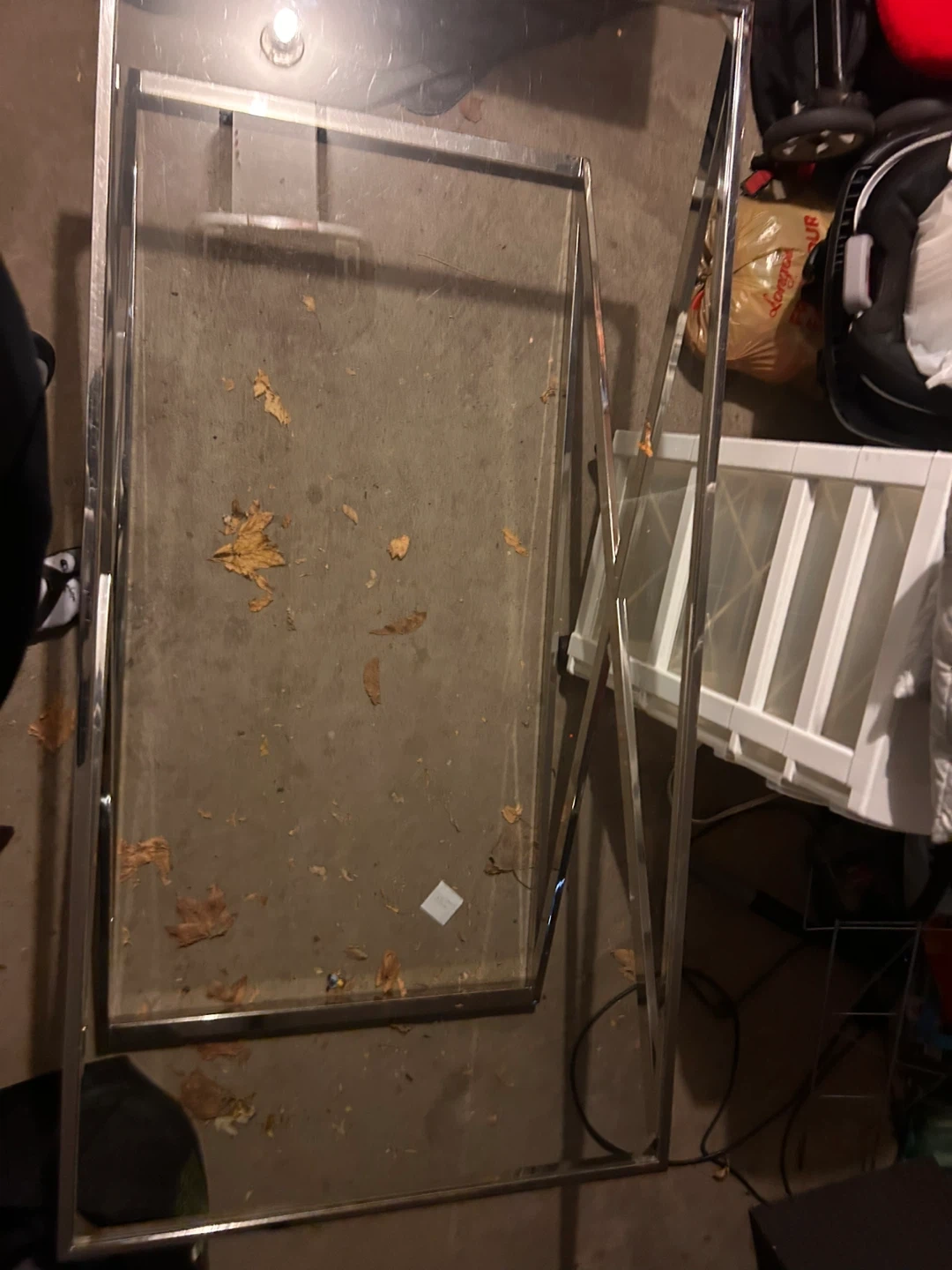 Selling a glass and metal coffee table frame. It's in okay condition and ready for a new glass top. Perfect for a DIY project or to replace a broken frame. Has scratches on it.