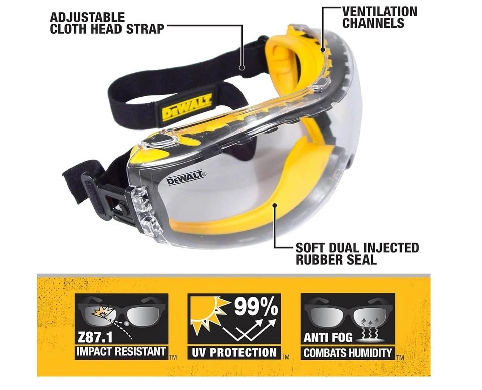 Anti-Fog Design: Built-in ventilation channels and DEWALT XtraClear coating to keep vision clear in all conditions.