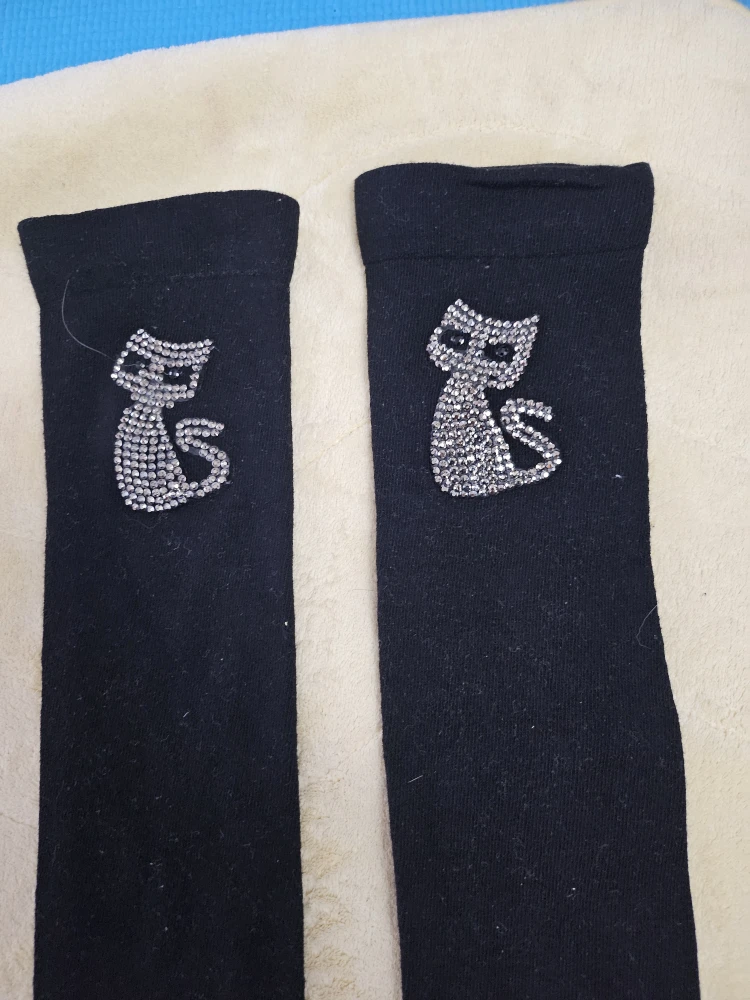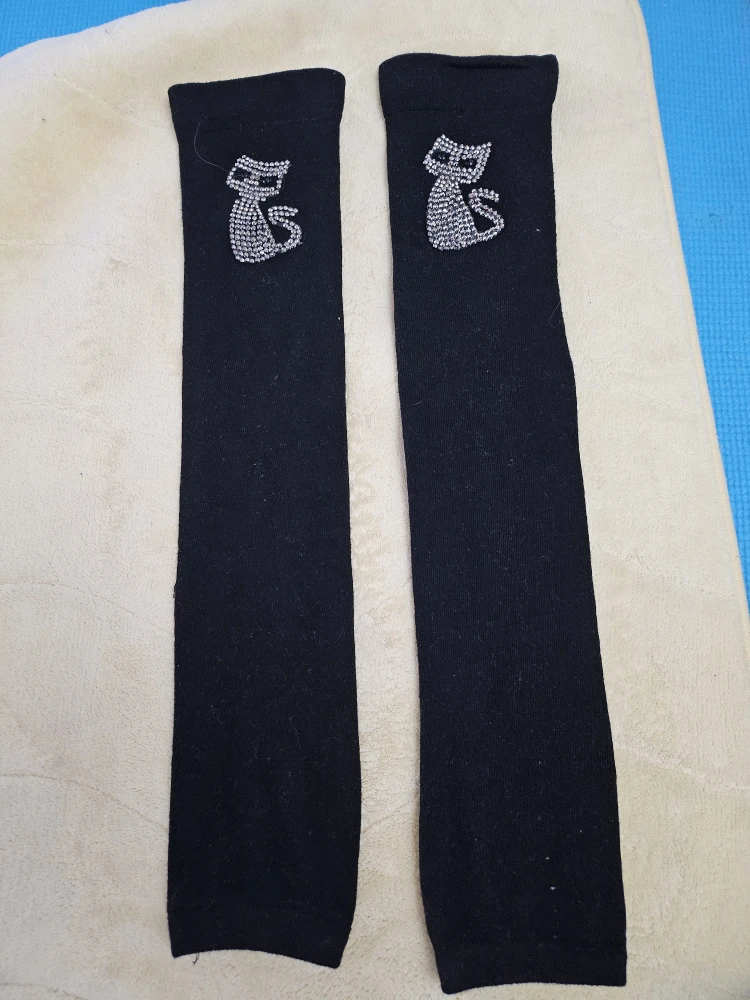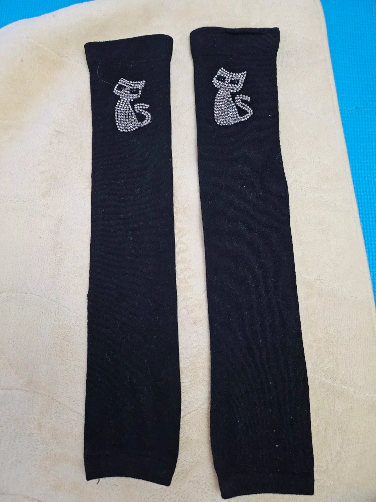 Here are a pair of black arm warmers featuring a cute cat design! They're perfect for adding a touch of style to your outfit while keeping your arms cozy.